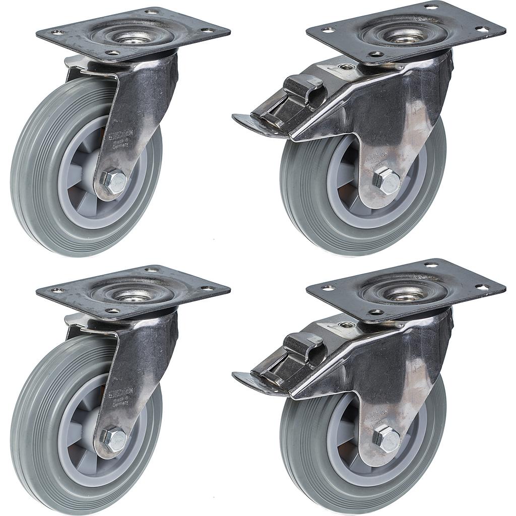 4 kpl:n sarja - 160 mm:n harmaat kumiset ruostumattomasta teräksestä valmistetut pyörät, joissa on ylälevy.Näissä 2 ruostumattomasta teräksestä valmistetuissa kääntyvissä ja 2 ruostumattomasta teräksestä valmistetuissa jarrullisissa kääntyvissä pyörissä on harmaat täyskumipyörät, joissa on muovinen keskiö ja liukulaakeri.Jarru lukitsee sekä kääntöpyörän että pyörän samanaikaisesti.Tuotteen mitat ovat seuraavat:Pyörän halkaisija: 160 mmPyörän kulutuspinnan leveys: 38mmPyörän laakeri: Pyörälaakeri: liukulaakeriYlälevyn koko: 140x110mmAsennusreikien keskikohdat: 105x75-80mm.Asennusreikien koko: 11mmKokonaiskorkeus: 195mmKantavuus: 135kg per pyörä (540kg per sarja).Pyörän kulutuspinnan kovuus 85° Shore A.Kohtuullinen vierintävastus, alhainen käyttömelu ja erittäin hyvä lattian säilyminen. Merkkaamaton.Hyvä kemiallinen kestävyys, lukuun ottamatta öljyjä.