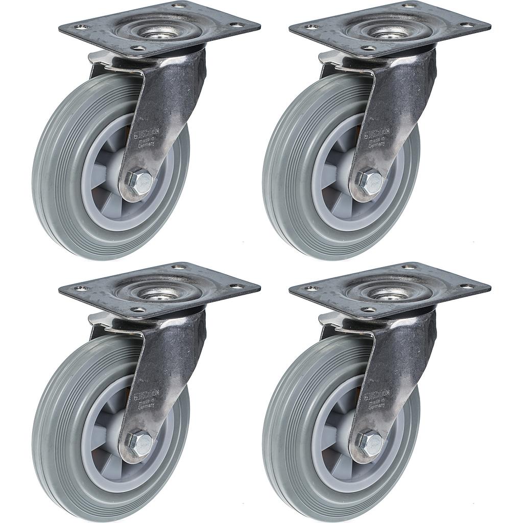 4 kpl:n sarja - 160 mm:n harmaat kumiset ruostumattomasta teräksestä valmistetut pyörät, joissa on ylälevy.Näissä 4 ruostumattomasta teräksestä valmistetuissa kääntyvissä pyörissä on harmaat täyskumipyörät, joissa on muovinen keskiö, liukulaakeri.Tuotteen mitat ovat seuraavat:Pyörän halkaisija: 160mmPyörän kulutuspinnan leveys: 38mmPyörän laakeri: Pyörälaakeri: liukulaakeriYlälevyn koko: 140x110mmAsennusreikien keskikohdat: 105x75-80mm.Asennusreikien koko: 11mmKokonaiskorkeus: 195mmKantavuus: 135kg per pyörä (540kg per sarja).Pyörän kulutuspinnan kovuus 85° Shore A.Kohtuullinen vierintävastus, alhainen käyttömelu ja erittäin hyvä lattian säilyminen. Merkkaamaton.Hyvä kemiallinen kestävyys, lukuun ottamatta öljyjä.