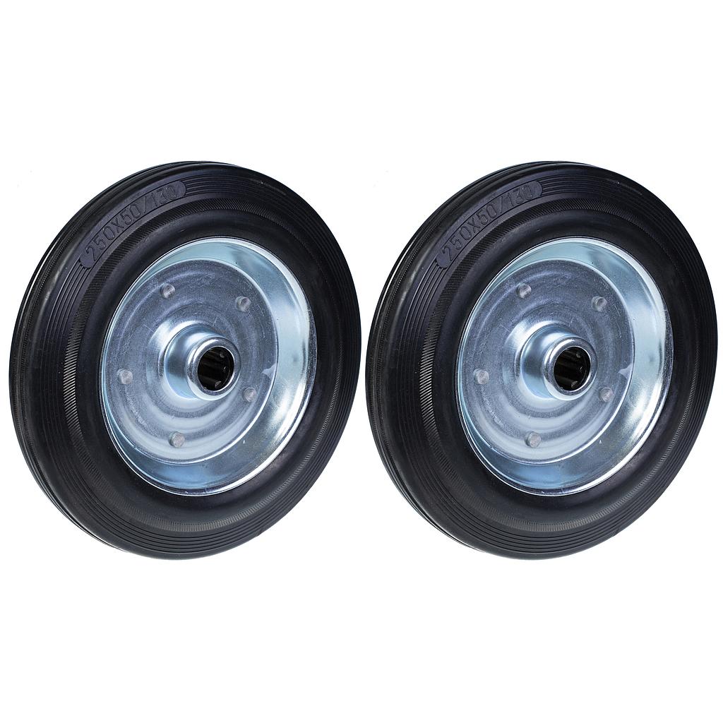 250 mm:n (10 tuuman) musta kumipyörä, jossa on puristetusta teräksestä valmistettu 25 mm:n keskiö, kantavuus 210 kg – sarja