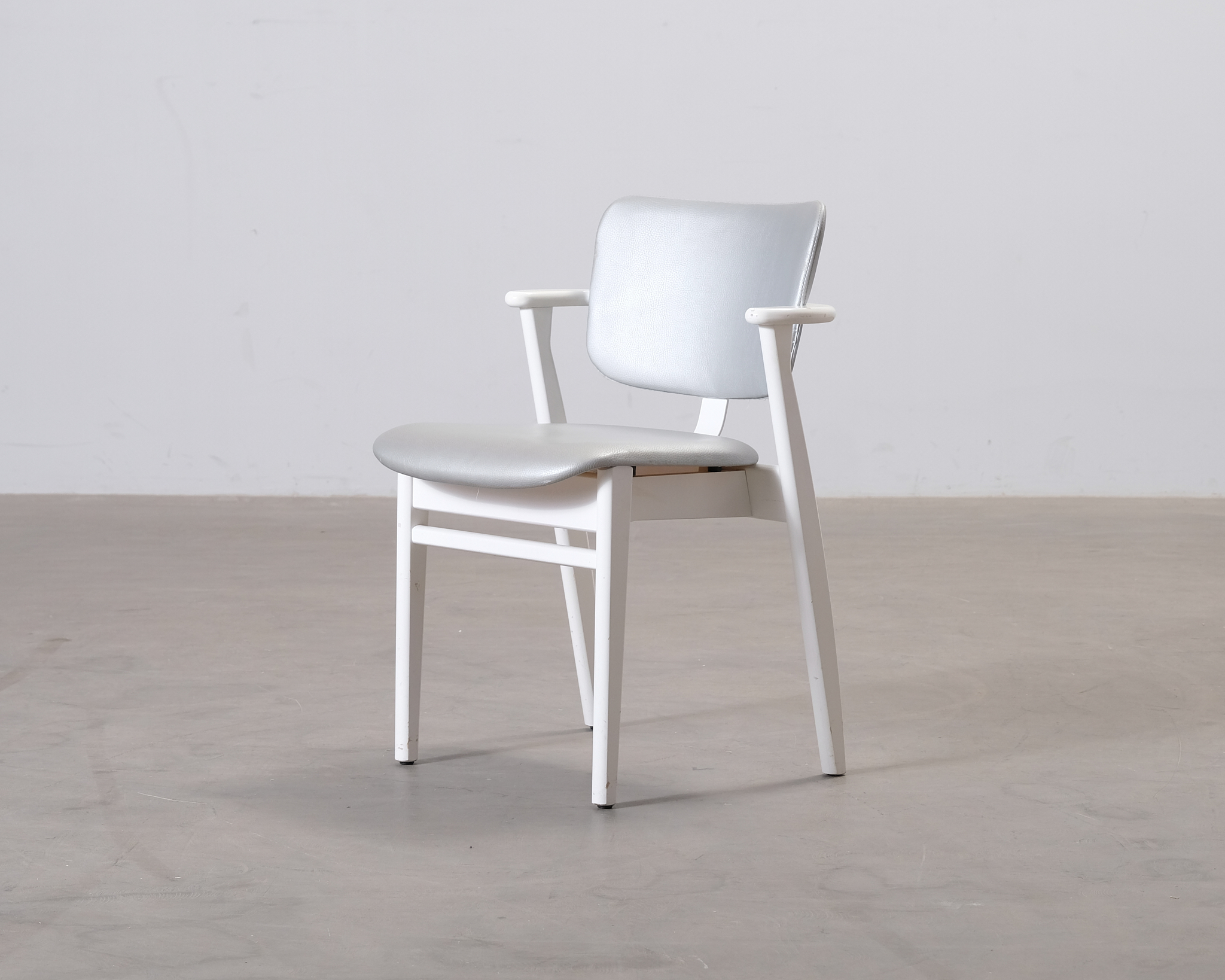 Ilmari Tapiovaara suunnitteli Domus-tuolin alunperin Domus Academican opiskelija-asuntolaan lukutuoliksi. Nykyään Domus-tuoli on yksi Tapiovaaran rakastetuimmista klassikoista. Ajaton design sopii kotiin kuin kotiin ja kestää vuosikymmeniä. Domus tuoli on erittäin mukava istua ja sen lyhyet käsinojat mahdollistavat tuolin vetämisen lähelle pöytää esimerkiksi työntekoa varten. Tässä Domus-tuolissa on hopean värinen tekonahkaverhoilu. Rungossa halkeama ja tuoli heiluu. Verhoilu on kulunut ja puuosien maalipinnassa vaurioita. Jaloissa tummia naarmuja.