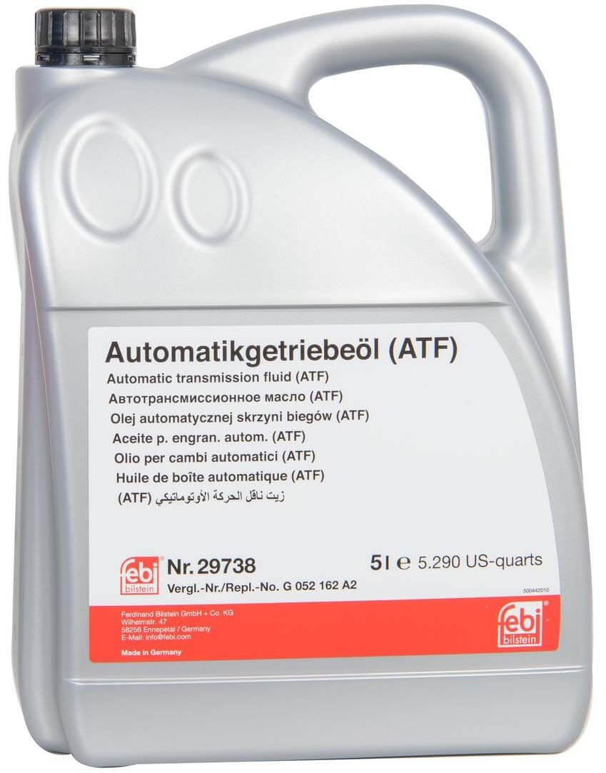 Febi 29738 on erityisesti Audi, BMW sekä VW -malleihin soveltuva ATF-öljy, joka on käytössä mm. useissa 4-lovisissa automaateissa. Käytetään myös joissain ohjaustehostimissa, katso tarkemmat vaatimukset ohjekirjasta Luokitukset ja vastaavuudet: - Audi G 052 162 A2 / G052162A1 - BMW 83 22 2 305 395 / 83 22 2 220 442 / 83 22 2 344 206 / 83 22 2 344 588 / 83 22 9 404 328 / 83 22 9 407 765 / 83 22 9 407 807 / 83 22 9 407 858 / 83 22 0 002 121 / ATF 4 / LA 2634 - Citroen Z 000169756 - Ford N052162-VX00 - Honda 08285-P9901ZT1 / PSF-S - Hyundai 03100-00100 / PSF-3 - Jaguar JLM 20238 / JLM 20237 - Mercedes-Benz 001 989 22 03 / 236.11 - MINI 83 22 9 407 858 - Opel 19 40 707 - Peugeot 9736.22 / Z 000169756 - Porsche 000 043 207 00 / 999 917 547 00 / 000 043 205 09 - Saab 90 513 486 - Seat/Skoda G 052 162 A2 - Toyota 08886-01206 / PSF EH - Vauxhall 90513486 - Volkswagen G 052 162 A2 / G052162A1 / LT 711 41 / TL 521 62 - Kia PSF-III - DTFR 13C110 - ZF LGF 5 / TE-ML 11B / TE-ML 14B / Lifeguard 5 - VOITH G 607