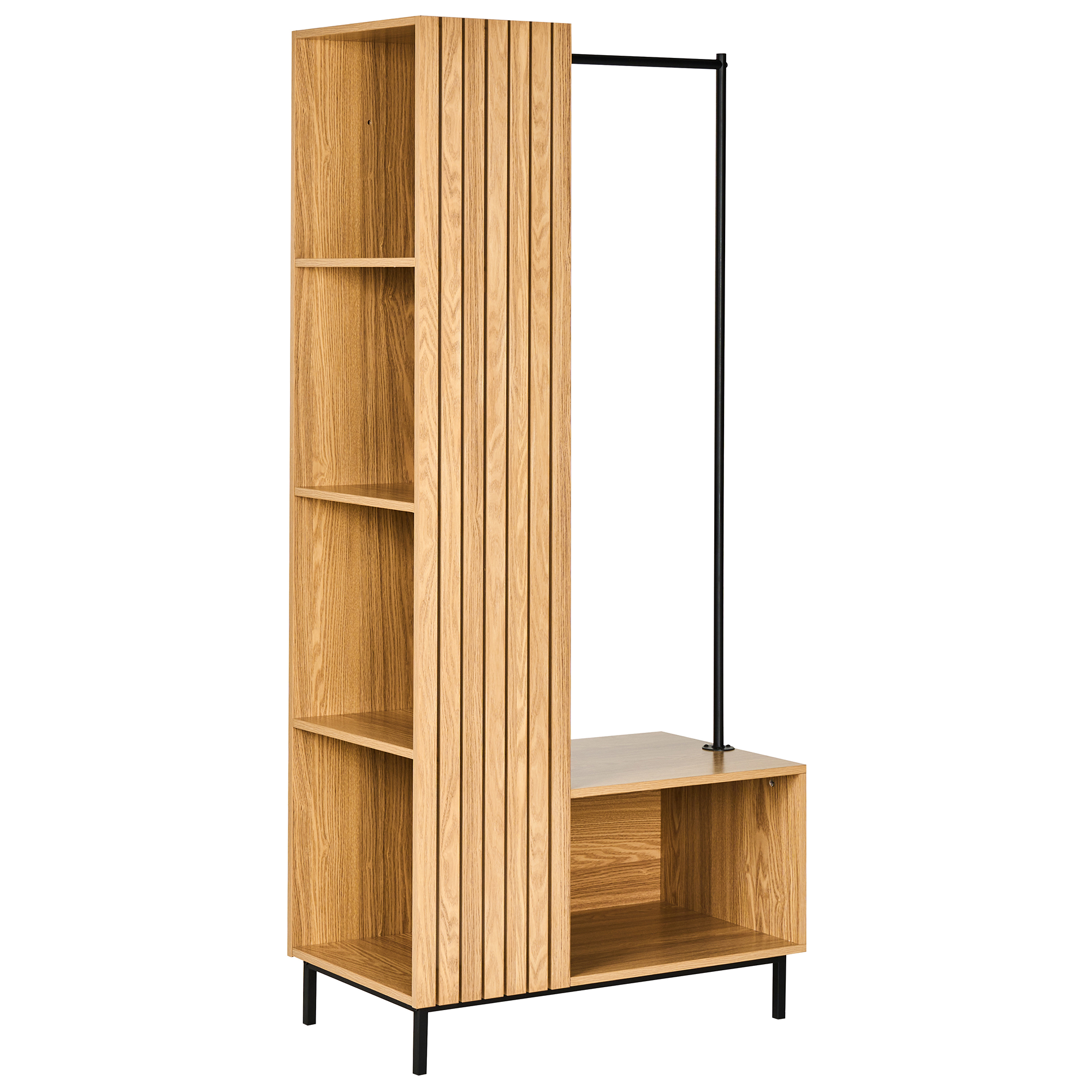 Vapaasti seisova vaatekaappi tangolla ja hyllyillä eteiseen. Tämä avovaatekaappi on erinomainen valinta eteisen järjestyksen ylläpitämiseen, ja se tarjoaa käytännöllistä säilytystilaa viidellä tilavalla hyllyllään ja vaatetangollaan. Sen runko on valmistettu puuta muistuttavalla paperiviilulla viimeistellystä MDF-levystä, ja mustat jalat sekä tanko ovat vankkaa rautaa, minkä ansiosta vaatekaappi yhdistää kestävyyden ja ajattoman muotoilun. Se sopii täydellisesti päivittäisten tavaroiden säilyttämiseen tai osaksi modulaarista kokonaisuutta eteisessä tai makuuhuoneessa, sisustustyylistä riippumatta.Tuotetiedot: Tuotetyyppi: Vaatekaappi Tyyli: Mökkityyli Pääväri: Ruskea Sävy: Vaaleanruskea Materiaali: Insinööripuu Päämateriaali: MDF-levy Lisämateriaali: Rauta Hyllyjen määrä: 5 Viimeistely: Paperiviilu Mitat: Syvyys: 45 cm Leveys: 76 cm Korkeus: 175 cm Paino: 22 kg Hyllyn kantokyky: 3 kg Tason kantokyky: 10 kg Hintaan sisältyy: 1 x Avovaatekaappi Ominaisuudet: Avonainen hylly helpottaa pääsyä, Koristeellinen mutta käytännöllinen, Moderni muotoilu, Vankka käsityö, Parhaan hoidon varmistamiseksi: suojaa lämpöä ja kosteutta vastaan lasinalusilla ja pöytätableteilla, Runsaasti säilytystilaa Kokoaminen: Kokonaan koottava. 20-40 min. Hoito-ohjeet: MDF-levy: 1.Puhdista miedolla puhdistusaineella ja pehmeällä liinalla. Pyyhi kuivaksi puhdistuksen jälkeen. Rauta: 1.Puhdista miedolla puhdistusaineella ja pehmeällä liinalla, pyyhi sitten kuivaksi 2.Naarmujen välttämiseksi älä käytä hankaavia puhdistusaineita 3.Käytä kupari- tai kromielementteihin kiillotusainetta.
