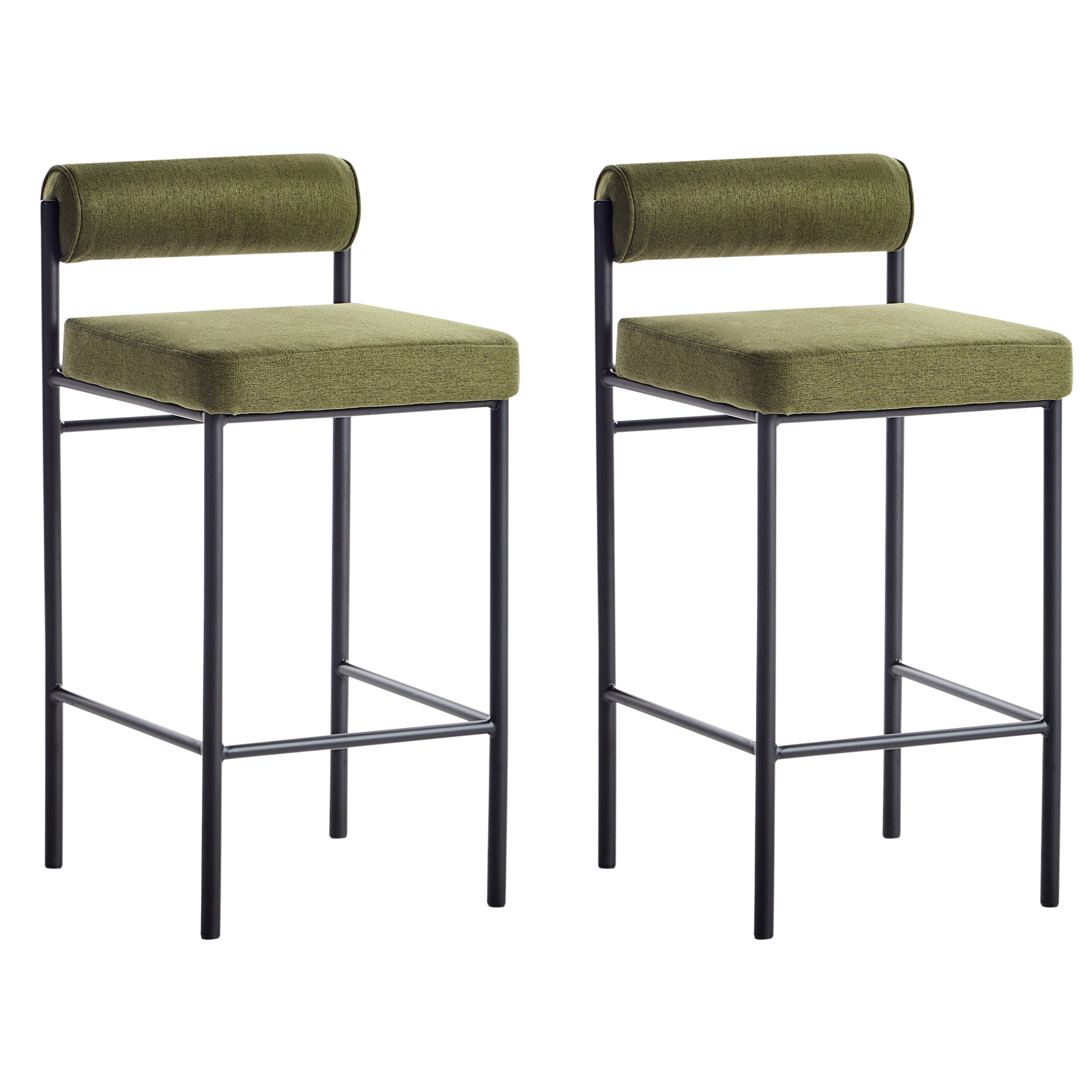 Moderni käsinojaton baarituolisetti. Kohota ruokailutilaa tai keittiötä hetkessä tällä tyylikkäällä kahden baarituolin setillä. Laadukkaalla vihreällä polyesterikankaalla verhoiltujen tuolien jalat on valmistettu kestävästä, mustaksi jauhemaalatusta raudasta. Matalat, sylinterimäiset ja pyöristetyt selkänojat sekä tukevat jalkatuet tarjoavat mukavan istumakokemuksen. Käsinojattoman muotoilun ansiosta ne on helppo työntää saarekkeen tai pöydän alle, silloin kun niitä ei tarvita. Muotoilunsa ja värimaailmansa ansiosta baarituolit sulautuvat useisiin sisustustyyleihin.Tuotetiedot: Tuotetyyppi: Baarijakkara Tyyli: Moderni Pääväri: Vihreä Sävy: Oliivinvihreä Materiaali: Kangas Päämateriaali: Kangas Lisämateriaali: Rauta Jalkojen materiaali: Metalli Istuinmateriaali: Kangas Materiaaliyhdistelmä: 100% polyesteriä Käsinojat: Ei Pinottavuus: Ei Mitat: Syvyys: 42 cm Istuimen paksuus: 6 cm Istuimen korkeus: 64 cm Leveys: 42 cm Korkeus: 82 cm Istuinala: 42x42 cm Paino: 6 kg Kantokyky: 150 kg Hintaan sisältyy: 2 x Baarituoli Ominaisuudet: Sopii mainiosti keittiöön tai ruokailuhuoneeseen, Leveä ja mukava istuin, Mukava jalkatuki, Ajaton muotoilu, Laadukas verhoilu, Jaloissa tapit lattian suojaamiseen Kokoaminen: Jalat asennettava. 20-40 min. Lisätiedot: Vakauden ja turvallisuuden takaamiseksi on suositeltavaa tarkistaa, että tuote on asennettu oikein kahden viikon jälkeen kokoamisesta. On myös suositeltavaa tarkistaa, että ruuvit ovat napakasti ruuvattuna joka kolmas kuukausi.