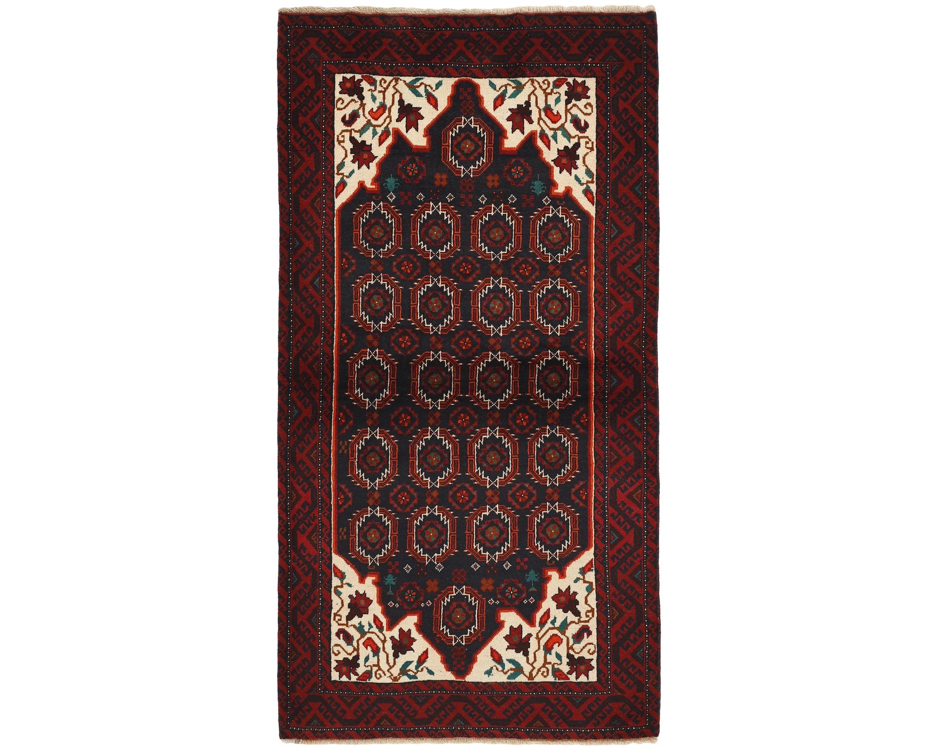 Balutch-matot tunnistaa kaarimaisista kuvioista ja tiiviistä sommittelusta. Kuviot koostuvat usein yksinkertaisista geometrisista elementeistä tai ruutumaisista rakenteista, ja toisinaan niissä esiintyy myös lintuja tai ihmishahmoja. Värimaailmaa hallitsevat syvänpunaiset sävyt, tummansininen ja valkoinen. Matot ovat käsinsolmittuja 100 % villasta, ja niiden solmutiheys vaihtelee 50 000–150 000 solmun välillä neliömetrillä. Käyttämätön.