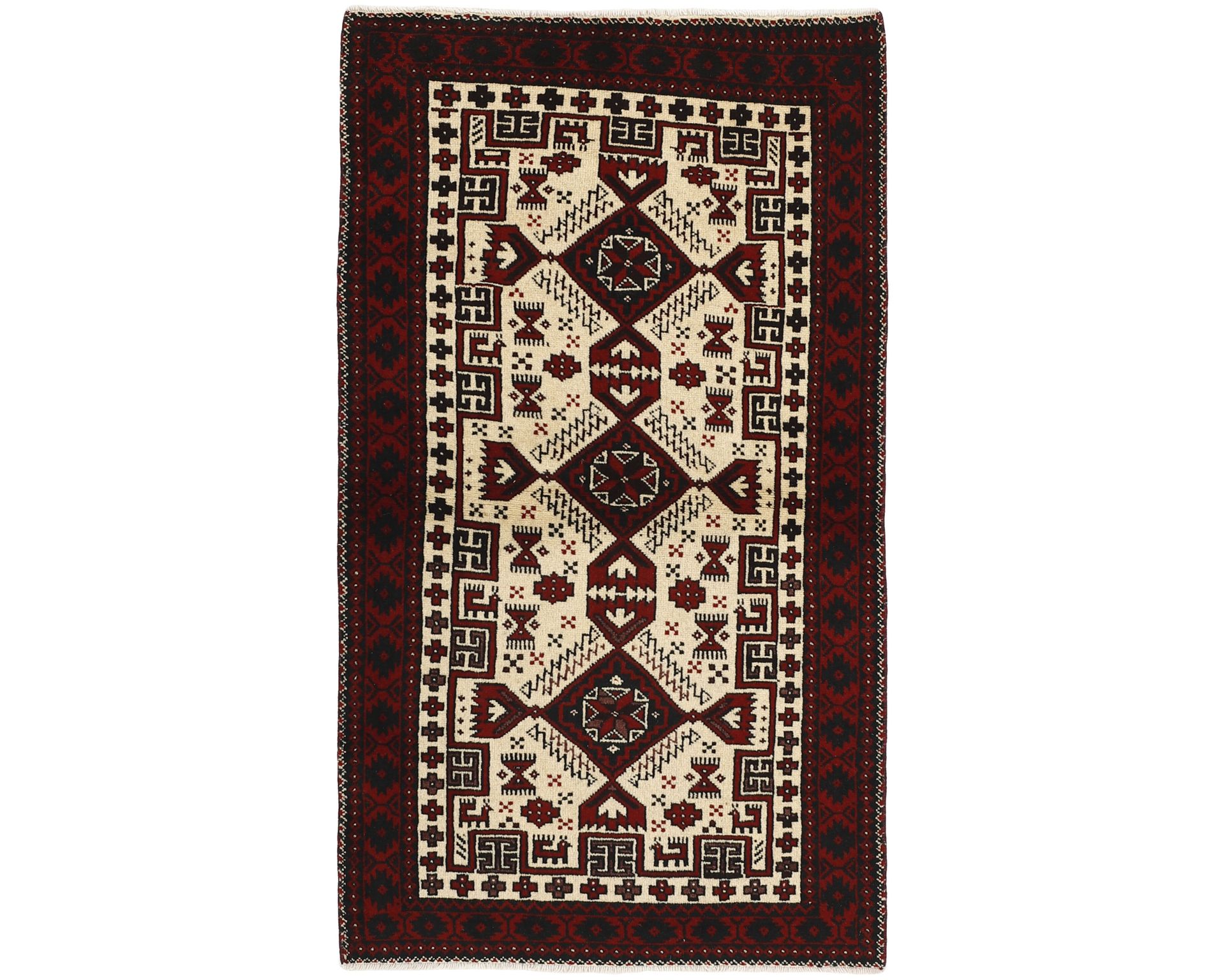 Balutch-matot tunnistaa kaarimaisista kuvioista ja tiiviistä sommittelusta. Kuviot koostuvat usein yksinkertaisista geometrisista elementeistä tai ruutumaisista rakenteista, ja toisinaan niissä esiintyy myös lintuja tai ihmishahmoja. Värimaailmaa hallitsevat syvänpunaiset sävyt, tummansininen ja valkoinen. Matot ovat käsinsolmittuja 100 % villasta, ja niiden solmutiheys vaihtelee 50 000–150 000 solmun välillä neliömetrillä. Käyttämätön.