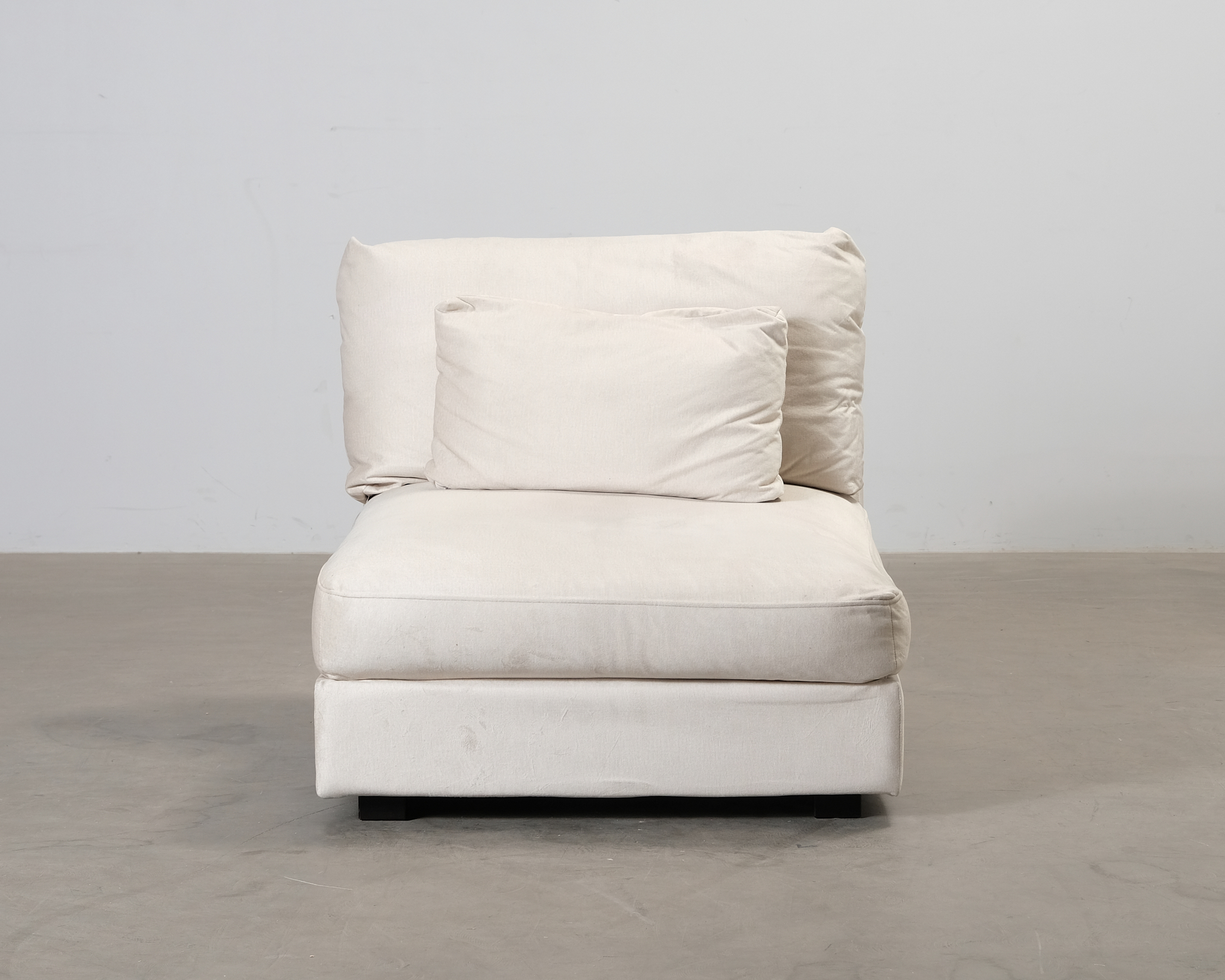Voit yhdistää Dubai sohvamoduulin sarjan muihin osiin tai käyttää sitä nojatuolina. Valkoinen samettikangasverhoilu ja puiset jalat alla.