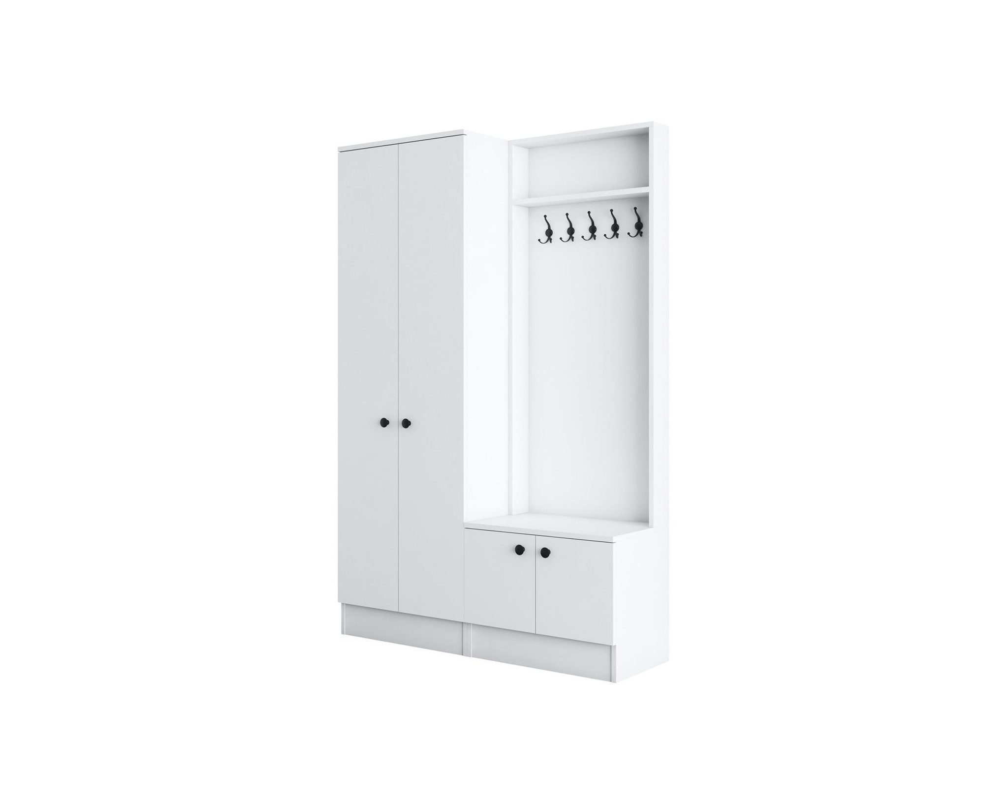 Käytännöllinen ja tyylikäs eteiskaluste, joka yhdistää penkin, säilytystilan sekä naulakon. Valmistettu MDF:stä.