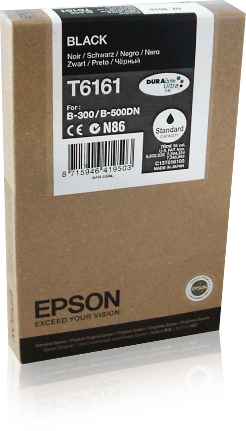 Luotettava pigmenttimuste tasalaatuiseen, terävään mustaan tekstiin ja tarkkoihin yksityiskohtiin Haalistumattomat tulosteet säilyttävät asiakirjat ja vähentävät uudelleentulostusten tarvetta ajan mittaan Vakio 76 ml:n kasetti tuottaa noin 3 000 mustavalkosivua kiireisille toimistoille Alkuperäinen Epson-koostumus varmistaa luotettavan suorituskyvyn ja yhteensopivuuden Toimii B-300-, B-310N-, B-500DN- ja B-510DN-tulostimien kanssa