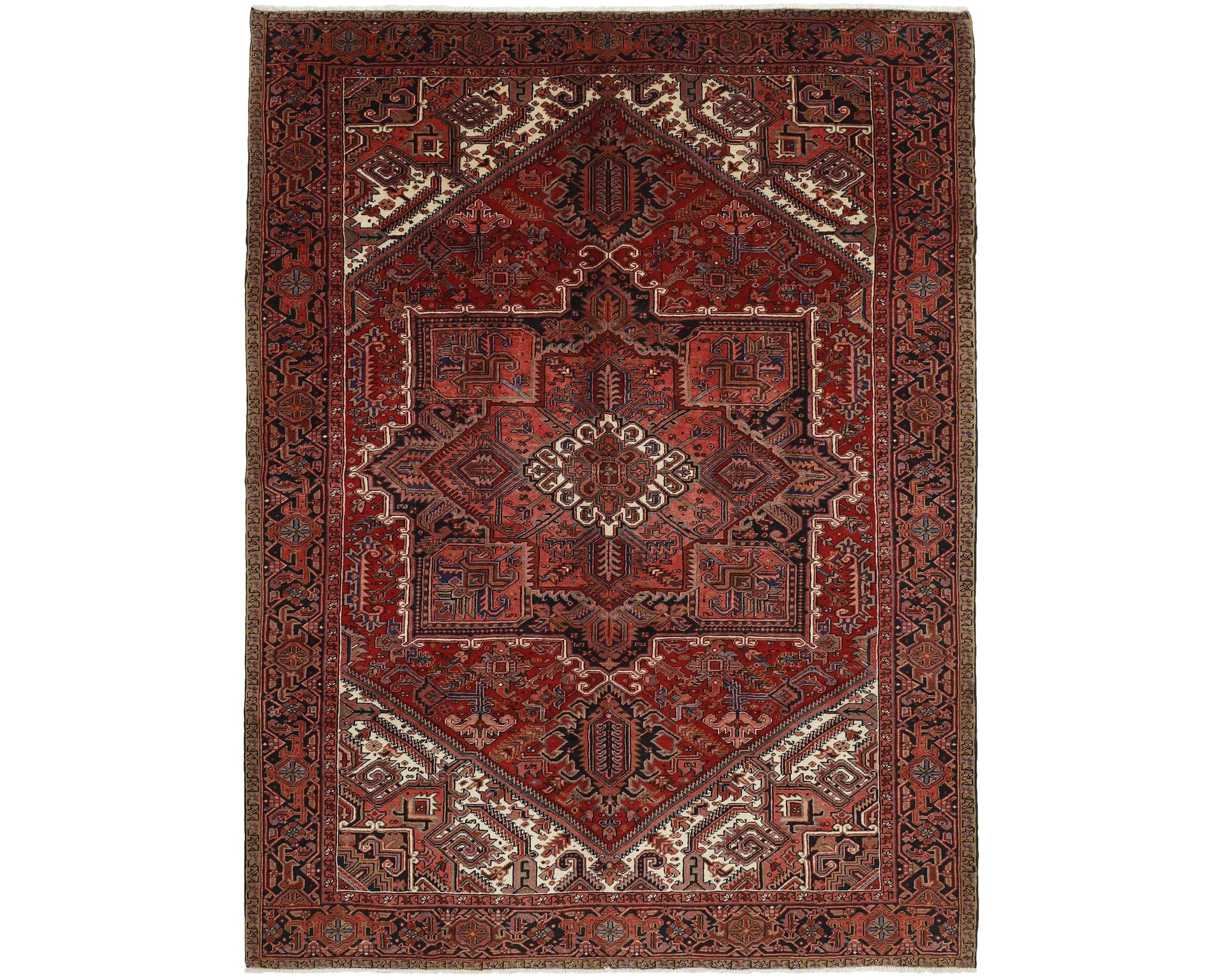 Heriz-matot ovat käsinsolmittuja villamattoja, joille ovat tyypillisiä voimakkaat geometriset kuviot, usein suuren keskimedaljongin ympärille rakentuen. Kestävä villanukka tekee matoista pitkäikäisiä ja hyvin kulutusta kestäviä. Solmutiheys on 150 000–250 000 solmua neliömetrillä, ja tiivis rakenne antaa Heriz-matoille niiden tunnusomaisen, tukevan tuntuman. Käyttämätön.