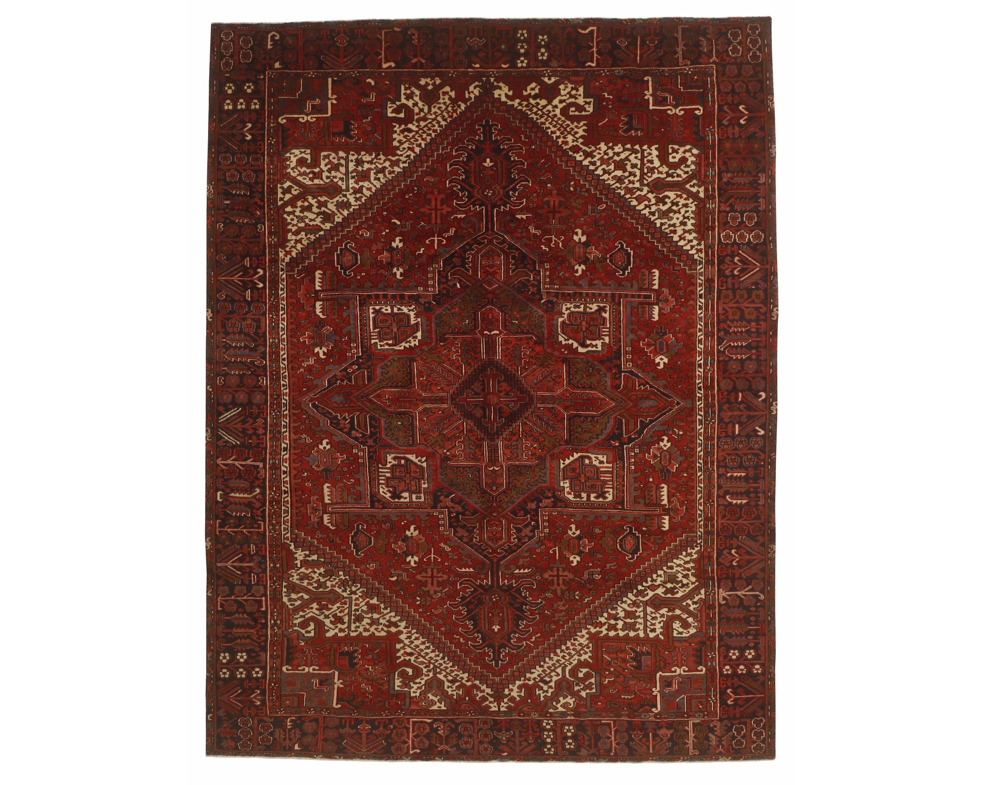 Heriz-matot ovat käsinsolmittuja villamattoja, joille ovat tyypillisiä voimakkaat geometriset kuviot, usein suuren keskimedaljongin ympärille rakentuen. Kestävä villanukka tekee matoista pitkäikäisiä ja hyvin kulutusta kestäviä. Solmutiheys on 150 000–250 000 solmua neliömetrillä, ja tiivis rakenne antaa Heriz-matoille niiden tunnusomaisen, tukevan tuntuman. Käyttämätön.