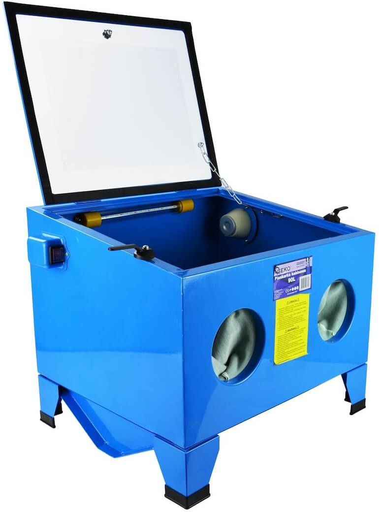 Geko 90 litran hiekkapuhalluskaappi on oiva apuri ruosteen, maalin ja muiden pintakerrosten poistoon. Se pitää pölyn ja hiekan siististi sisällä, ja sisäänrakennettu valo varmistaa tarkan työnjäljen. Sopii mainiosti niin harrastelijan verstaalle kuin ammattilaisen käyttöön.