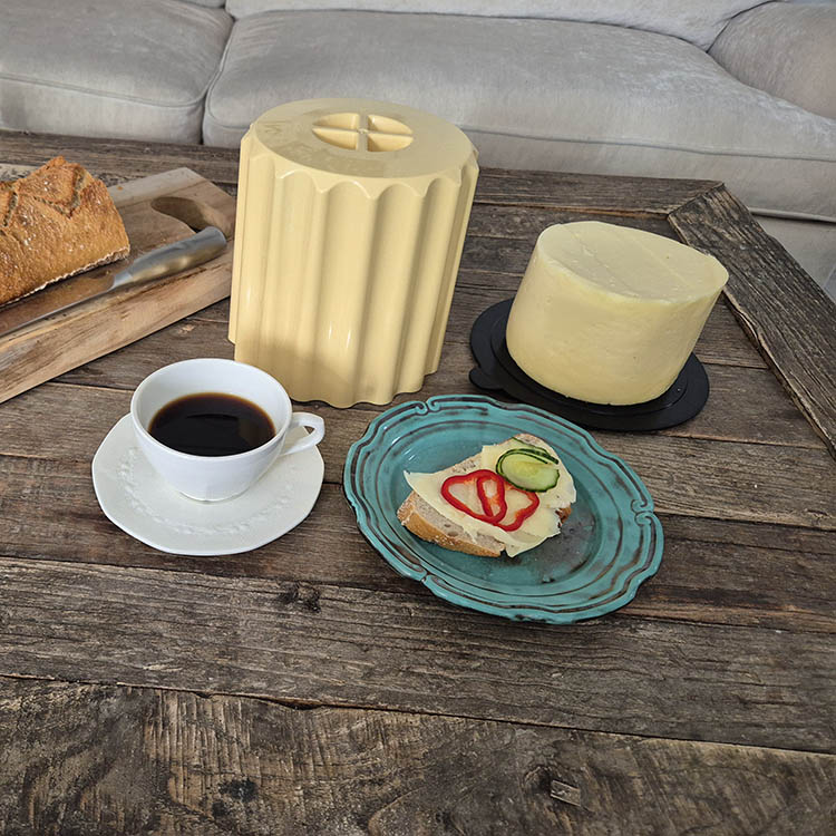 Sopii pyöreille, korkeille juustoilleRuotsissa valmistettu ja ympäristöystävällinenKaunis muotoilu neljässä värissäTyylikäs ja toimiva juustokupu kermajuustolle ja muille pyöreille, korkeille juustoille. Juustokuvussa on tukeva pohja, jossa on pienet jalat, jotka estävät kondensaation, joten voit asettaa sen suoraan pöytäliinan päälle ilman tahrojen tai kosteuden riskiä. Rakenteensa ja neljän tyylikkään värivaihtoehdon ansiosta siitä tulee sekä käytännöllinen että koristeellinen yksityiskohta keittiöön. Valmistettu Ruotsissa ympäristöystävällisestä ja elintarvikehyväksytystä ABS-muovista. Juustokupu korkeille juustoilleJuustokupu on suunniteltu sopimaan erityisen hyvin korkeille, pyöreille juustoille, joten se sopii erinomaisesti kermajuustoille ja muille isommille juustoille. Se tarjoaa suojaa ja auttaa säilyttämään juuston maun ja rakenteen pitämällä sen tuoreena pidempään.Design, joka sopii jokaiseen keittiöönJuustokupu on saatavana neljässä tyylikkäässä värissä - sinisenä, vaaleanpunaisena, vihreänä ja keltaisena - joten voit valita keittiösi sisustukseen parhaiten sopivan värin. Juustokupu on myös pinottava ja astianpesukoneenkestävä, mikä tekee puhdistamisesta helppoa ja hygieenistä. Juustolautanen on valmistettu Ruotsissa ympäristöystävällisestä ABS-muovista. Osallistuu hyvään tarkoitukseenJokaisesta myydystä juustokuvusta 1 % tuotosta lahjoitetaan Ruotsin lapsisyöpäsäätiölle. Ostamalla tämän tuotteen teet paitsi fiksun valinnan keittiöösi, myös osallistut tärkeän hyväntekeväisyysjärjestön tukemiseen. Tekniset tiedotMateriaali: Elintarvikelaatuista ja kierrätettävää ABS-muoviaVäri: Sininen, vaaleanpunainen, vihreä tai keltainenKorkeus: 18 cmHalkaisija: 18 cmPakkauskohtainen määrä: 1Valmistusmaa: RuotsiInnovaattori: Anne Sundel