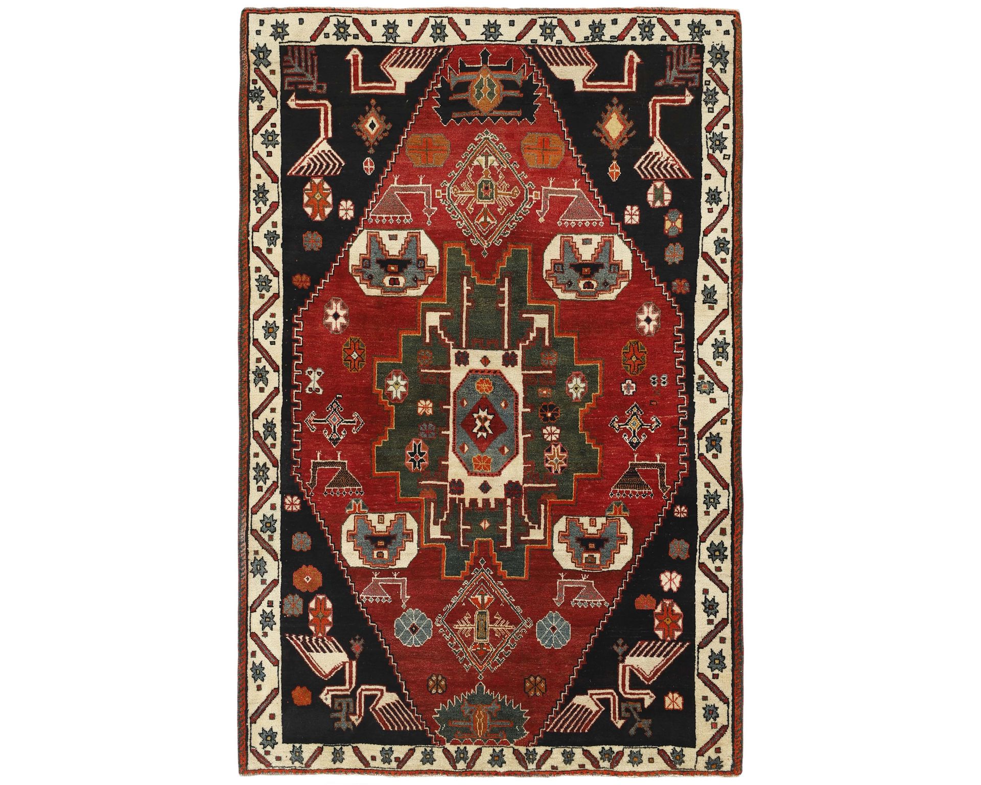 Kashghai-matot ovat käsinsolmittuja villamattoja, joille ovat ominaisia syvät värit, erityisesti punaiset sävyt, sekä tiivis rakenne. Matoissa on hyvin jäsennelty sommittelu, mikä rakentuu keskelle asetetun medaljongin ja koristeellisten reunojen ympärille. Perinteiset kuviot ovatkin avainasemassa maton runsaan ja yksityiskohtaisen ilmeen synnyssä. Solmutiheys vaihtelee 150 000–250 000 solmun välillä neliömetrillä. Käyttämätön.