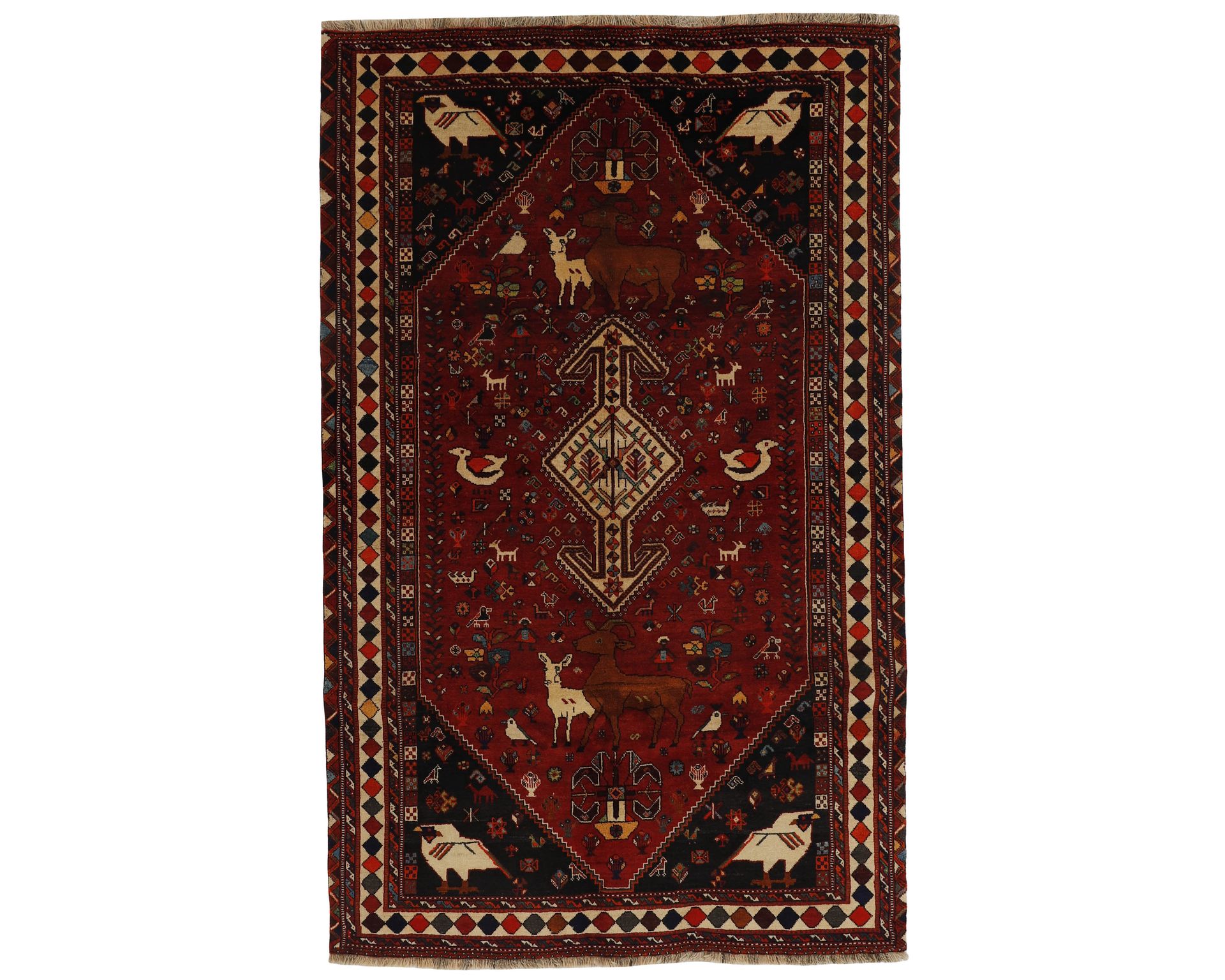 Kashghai-matot ovat käsinsolmittuja villamattoja, joille ovat ominaisia syvät värit, erityisesti punaiset sävyt, sekä tiivis rakenne. Matoissa on hyvin jäsennelty sommittelu, mikä rakentuu keskelle asetetun medaljongin ja koristeellisten reunojen ympärille. Perinteiset kuviot ovatkin avainasemassa maton runsaan ja yksityiskohtaisen ilmeen synnyssä. Solmutiheys vaihtelee 150 000–250 000 solmun välillä neliömetrillä. Käyttämätön.