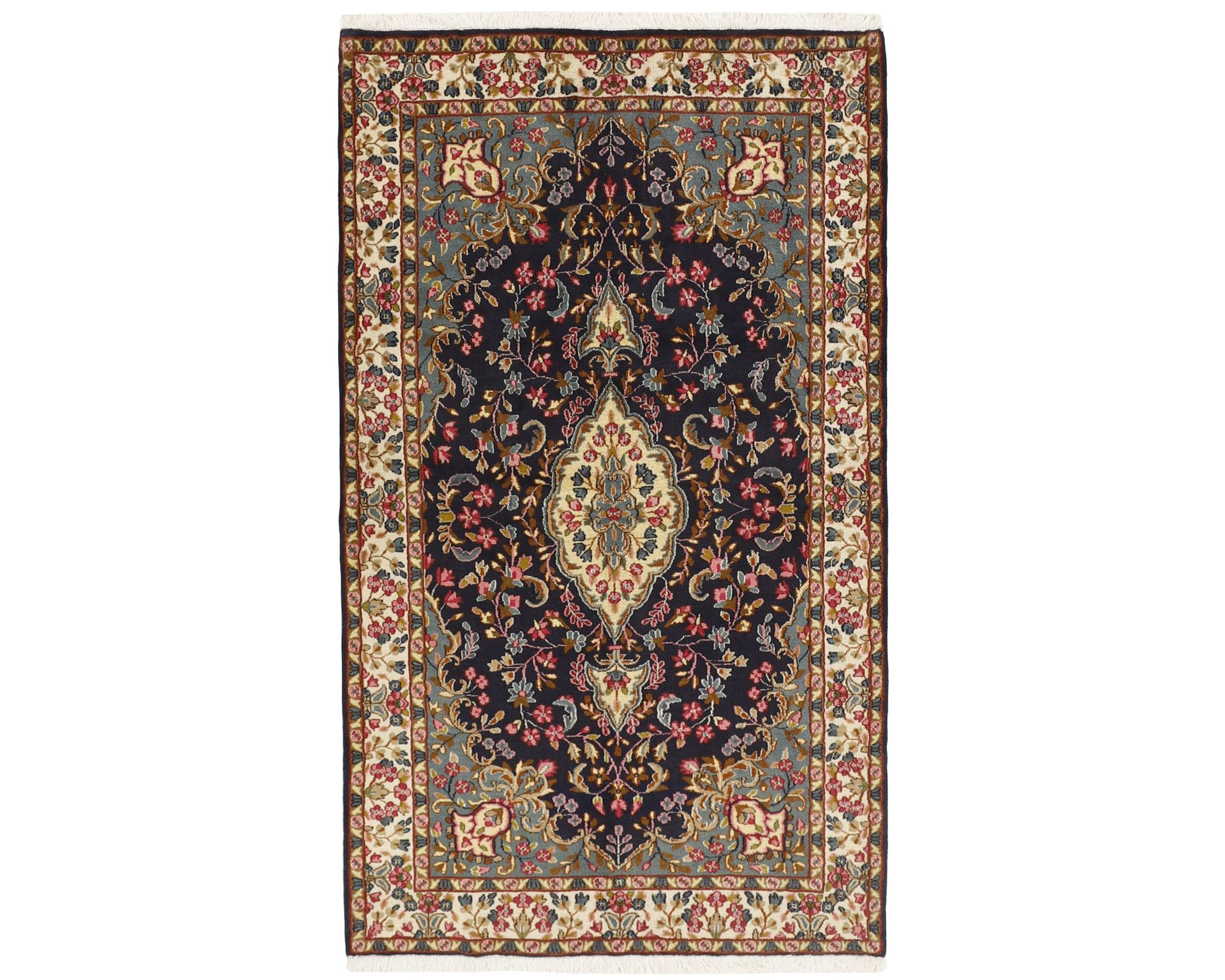 Kerman-matot ovat käsinsolmittuja villamattoja, joissa on pehmeä, samettimainen nukka ja puuvillaloimi. Ne tunnetaan hienostuneesta värimaailmastaan ja tarkasti viimeistellyistä kuvioistaan, joihin voi sisältyä kukka-, boteh- tai muita klassisia kuvioita. Koristeellisuudestaan huolimatta sommittelu on tasapainoinen, mikä antaa matoille elegantin ja rauhallisen ilmeen. Solmutiheys vaihtelee 250 000–350 000 solmun välillä neliömetrillä. Käyttämätön.