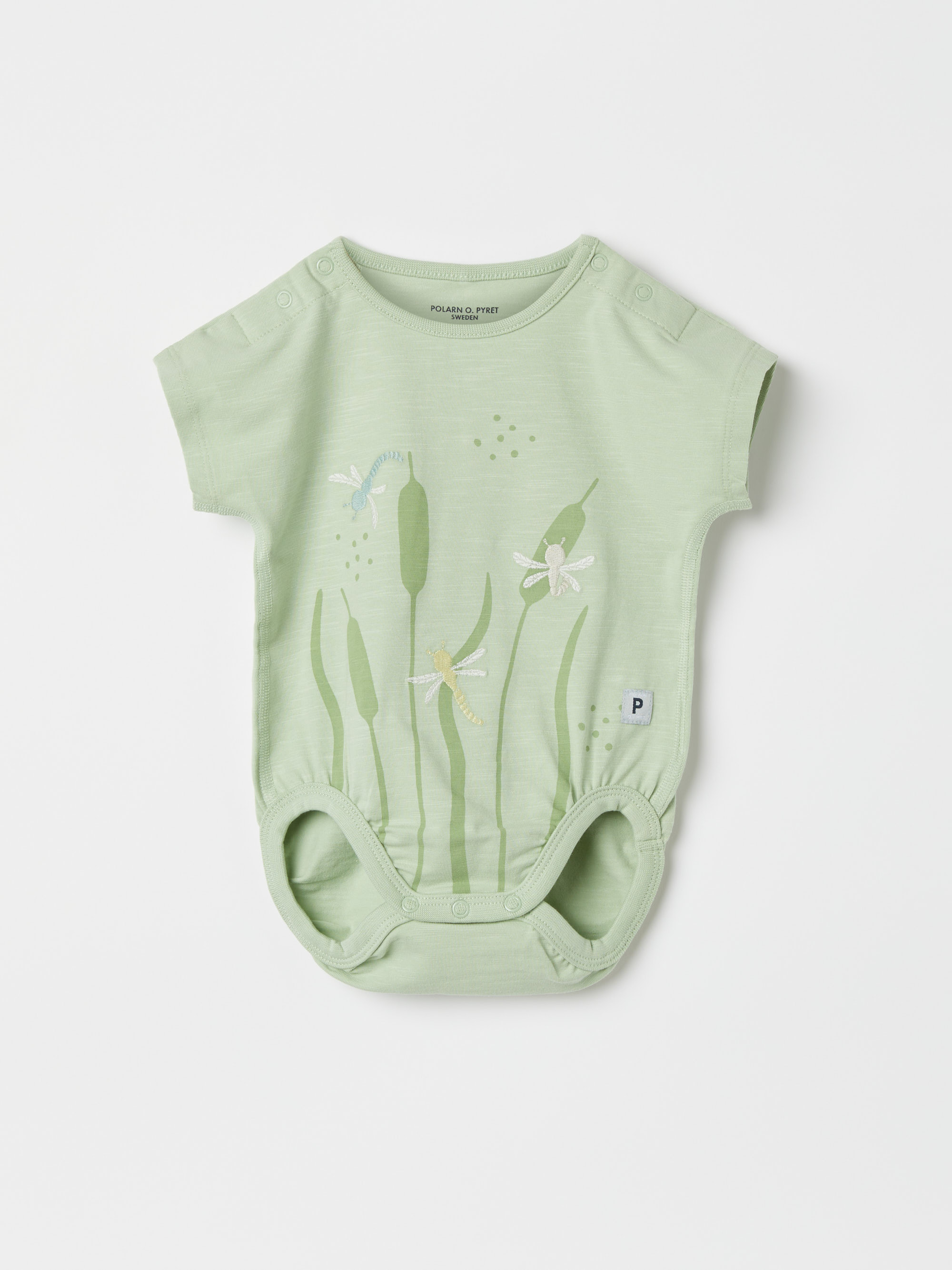 Vauvan lyhythihainen body 100 % luomupuuvillaa. Väljä istuvuus. Täydellinen lämpimiin päiviin! Bodyssa on kaunis sudenkorentobrodeeraus ja erittäin pehmeät ja litteät saumat, jotka tuntuvat mukavilta herkkää ihoa vasten. Nepparit toisella olkapäällä ja haarassa helpottavat pukemista. Koossa 50–56 on napit molemmilla olkapäillä. Ominaisuudet: • Wide fit -istuvuus • YKK-nepparit • Erittäin pehmeät saumat Tuoteturvallisuus: KEEP AWAY FROM FIRE<br/>Lyhythihainen body brodeerauksella, sudenkorento