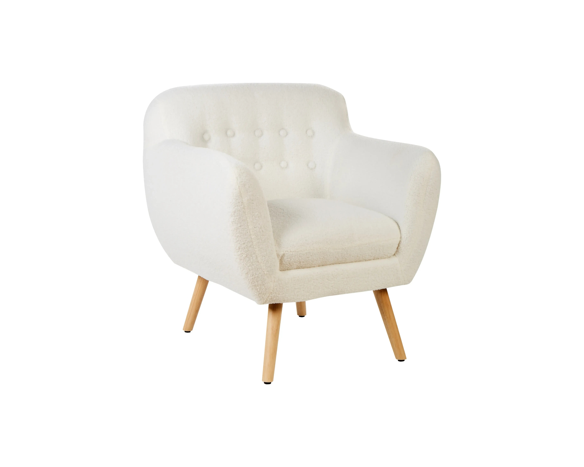 Melby on ihanan mukava ja pehmeä, nojatuoli joka yhdistää klassisia elementtejä moderniin muotoiluun luoden elegantin kokonaisuuden, joka asettuu helposti yhteen erilaisten sisustustyylien kanssa. Valkoinen bouclé-verhoilu ja puiset jalat viimeistelevät nojatuolin kauniin ilmeen.