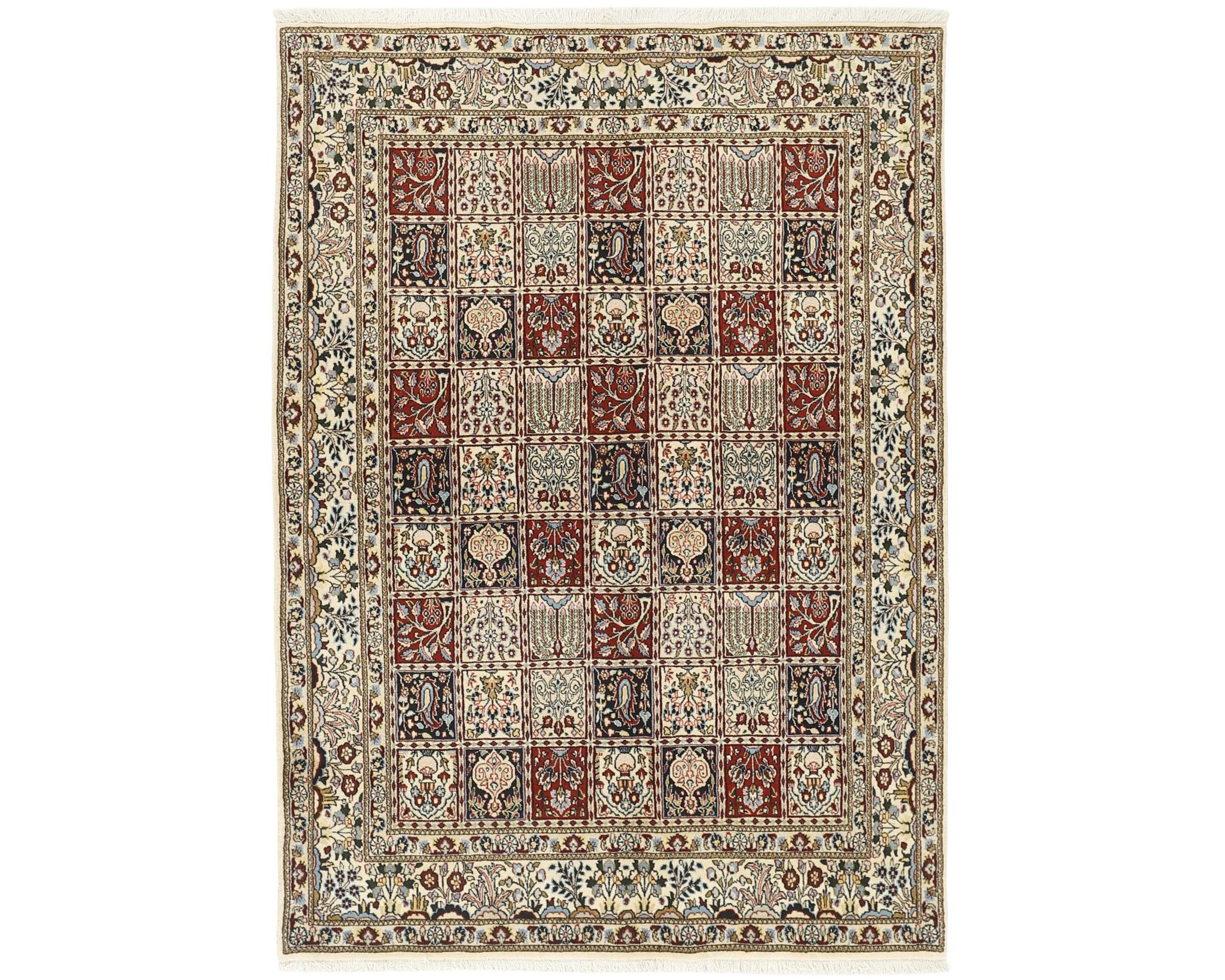 Moud Garden -matot ovat käsinsolmittuja villamattoja, joissa on puuvillinen loimi. Niiden kuviointi koostuu tyylitellystä puutarhakuvioista, jota kehystävät perinteiset persialaiset reunukset. Värimaailma on hillitty ja harmoninen, painottuen norsunluun, sinisen ja ruskean sävyihin. Solmutiheys on 250 000–350 000 solmua neliömetrillä. Käyttämätön.