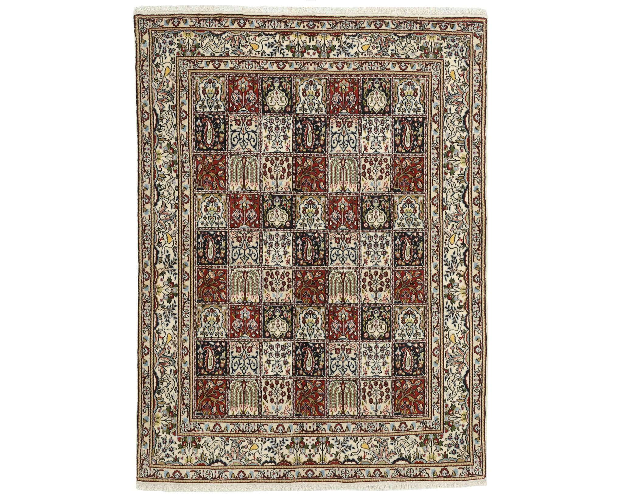 Moud Garden -matot ovat käsinsolmittuja villamattoja, joissa on puuvillinen loimi. Niiden kuviointi koostuu tyylitellystä puutarhakuvioista, jota kehystävät perinteiset persialaiset reunukset. Värimaailma on hillitty ja harmoninen, painottuen norsunluun, sinisen ja ruskean sävyihin. Solmutiheys on 250 000–350 000 solmua neliömetrillä. Käyttämätön.