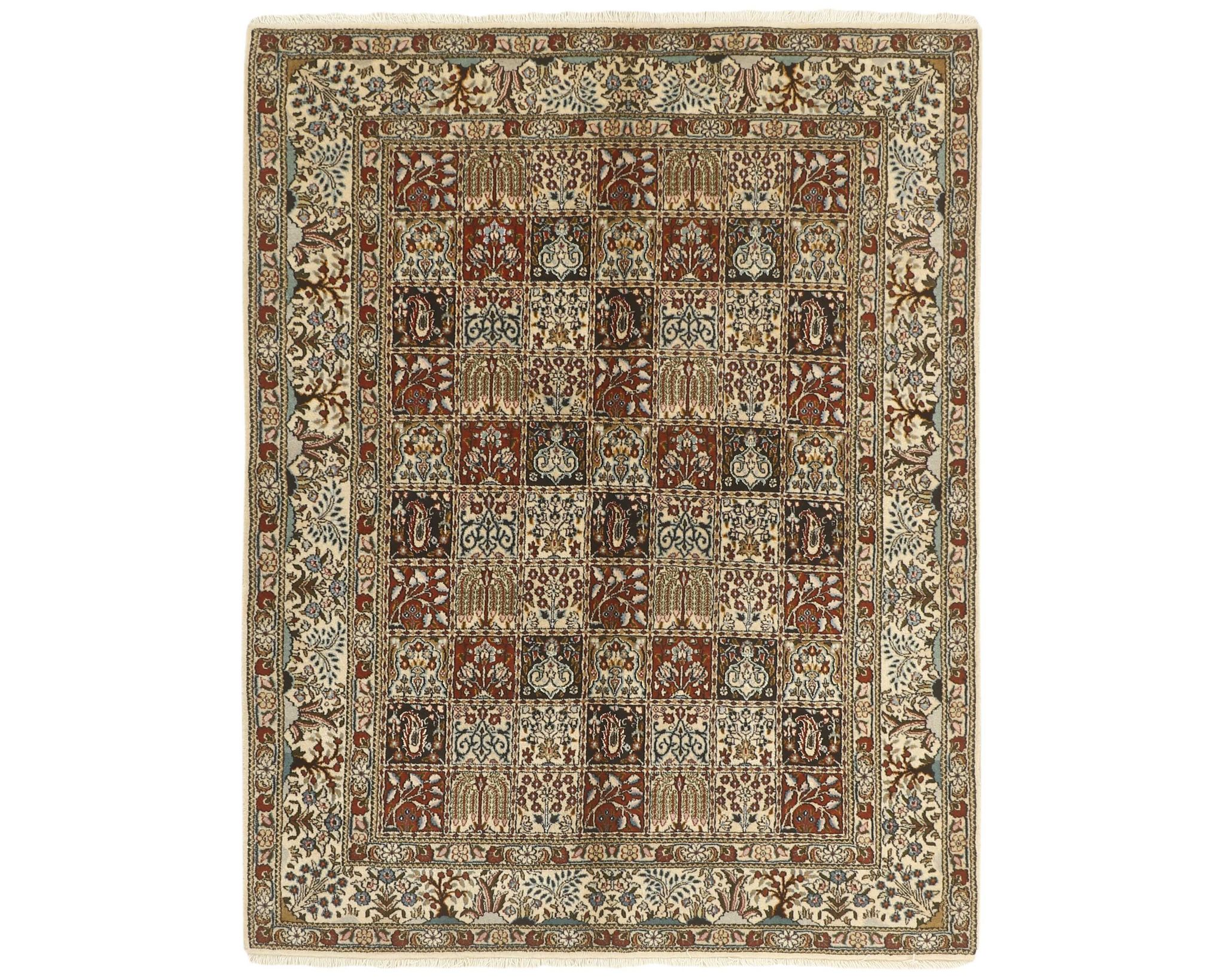 Moud Garden -matot ovat käsinsolmittuja villamattoja, joissa on puuvillinen loimi. Niiden kuviointi koostuu tyylitellystä puutarhakuvioista, jota kehystävät perinteiset persialaiset reunukset. Värimaailma on hillitty ja harmoninen, painottuen norsunluun, sinisen ja ruskean sävyihin. Solmutiheys on 250 000–350 000 solmua neliömetrillä. Käyttämätön.
