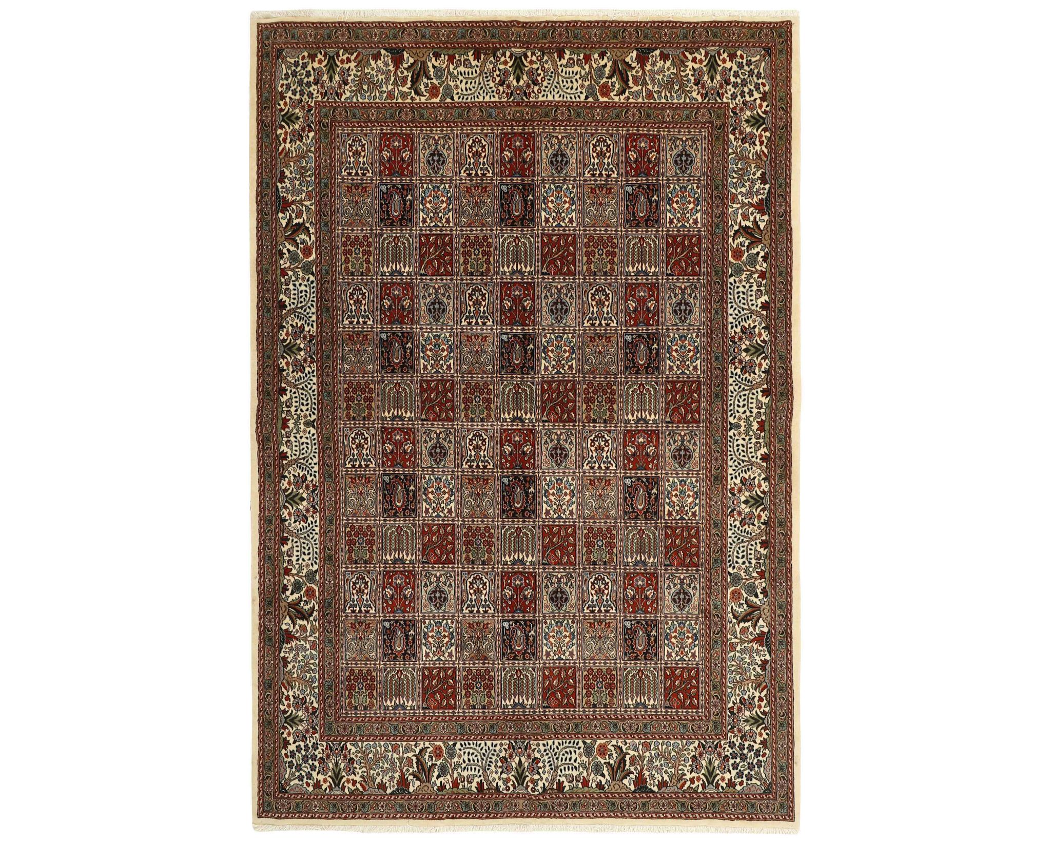 Moud Garden -matot ovat käsinsolmittuja villamattoja, joissa on puuvillinen loimi. Niiden kuviointi koostuu tyylitellystä puutarhakuvioista, jota kehystävät perinteiset persialaiset reunukset. Värimaailma on hillitty ja harmoninen, painottuen norsunluun, sinisen ja ruskean sävyihin. Solmutiheys on 250 000–350 000 solmua neliömetrillä. Käyttämätön.