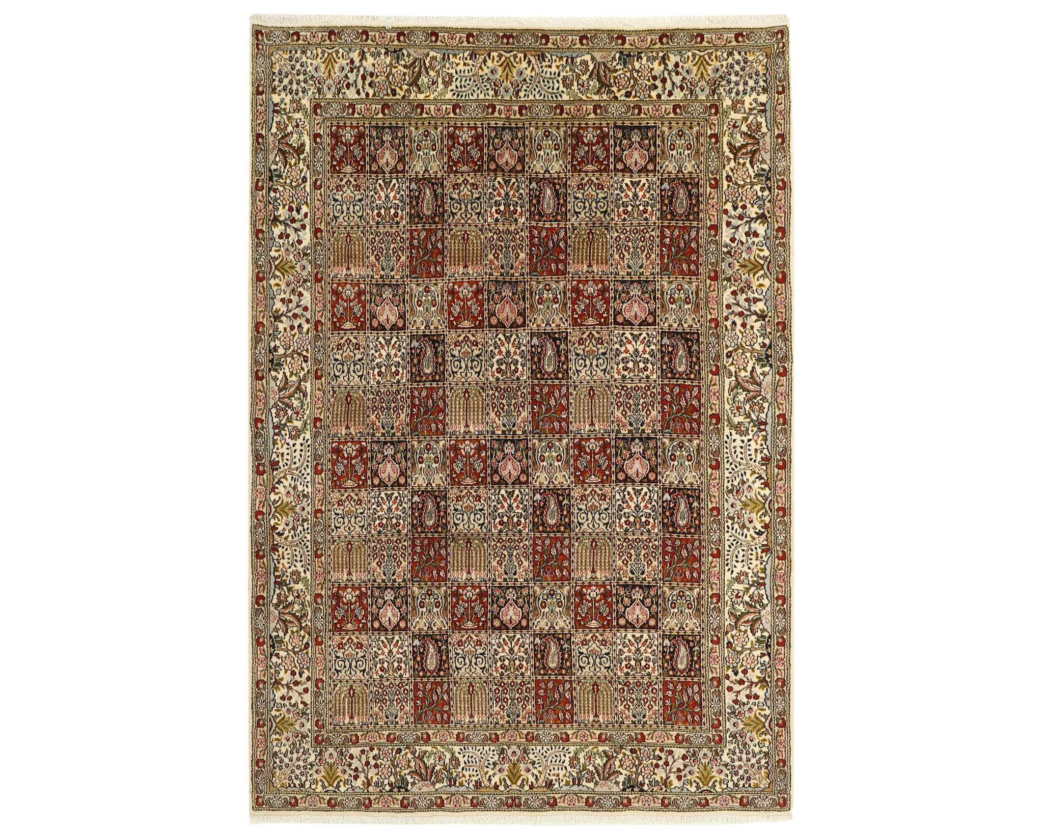 Moud Garden -matot ovat käsinsolmittuja villamattoja, joissa on puuvillinen loimi. Niiden kuviointi koostuu tyylitellystä puutarhakuvioista, jota kehystävät perinteiset persialaiset reunukset. Värimaailma on hillitty ja harmoninen, painottuen norsunluun, sinisen ja ruskean sävyihin. Solmutiheys on 250 000–350 000 solmua neliömetrillä. Käyttämätön.