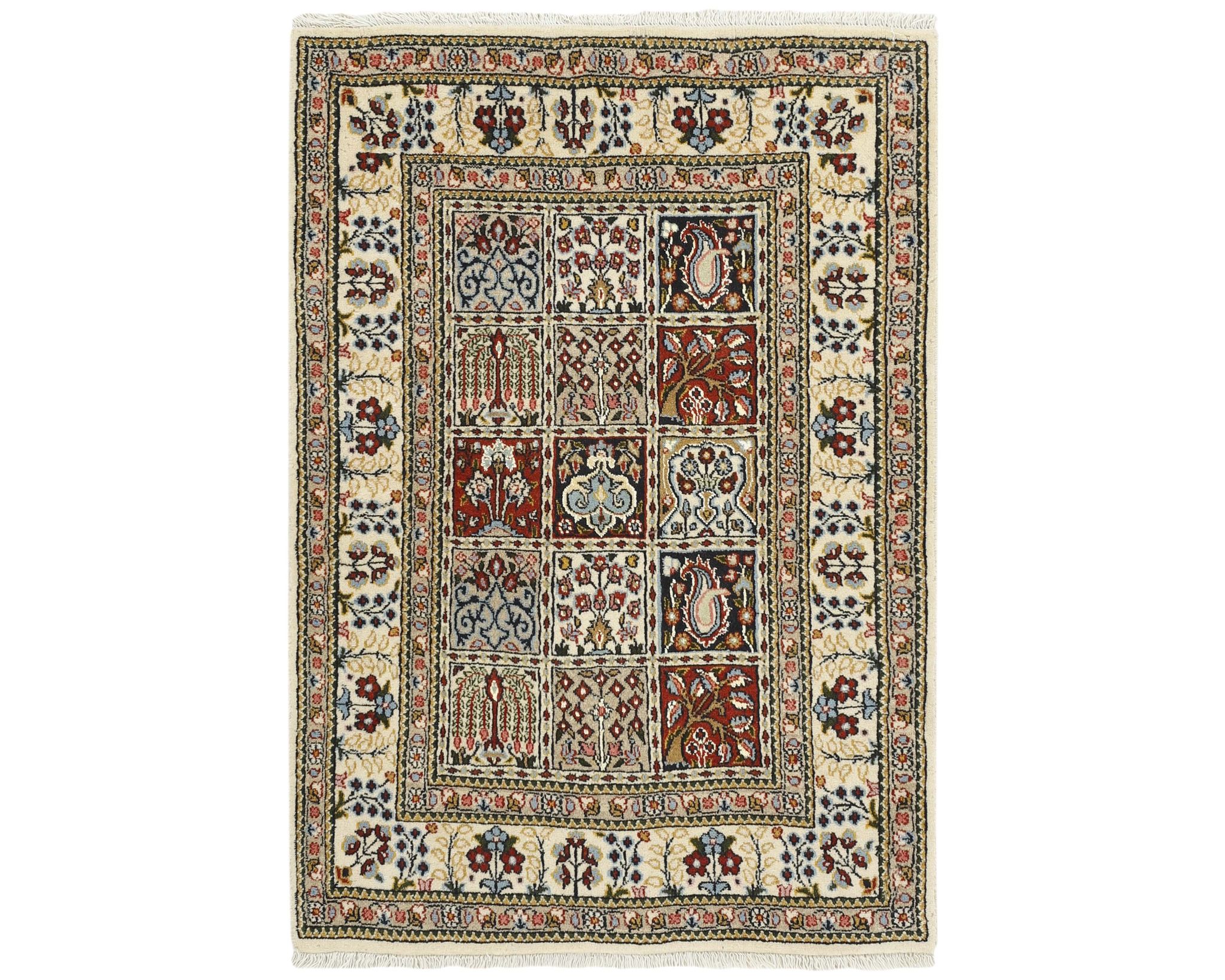 Moud Garden -matot ovat käsinsolmittuja villamattoja, joissa on puuvillinen loimi. Niiden kuviointi koostuu tyylitellystä puutarhakuvioista, jota kehystävät perinteiset persialaiset reunukset. Värimaailma on hillitty ja harmoninen, painottuen norsunluun, sinisen ja ruskean sävyihin. Solmutiheys on 250 000–350 000 solmua neliömetrillä. Käyttämätön.