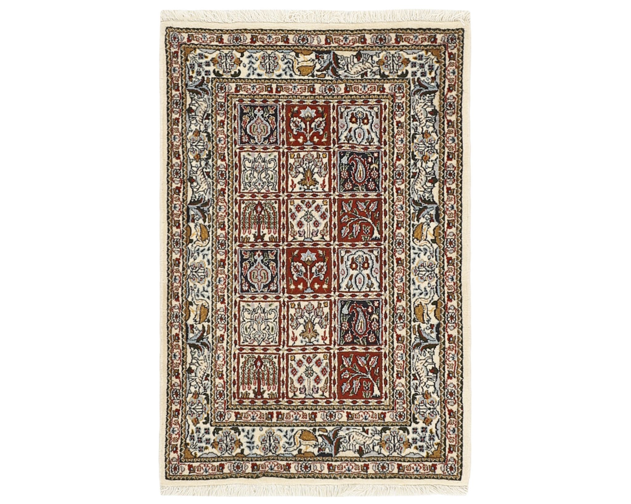 Moud Garden -matot ovat käsinsolmittuja villamattoja, joissa on puuvillinen loimi. Niiden kuviointi koostuu tyylitellystä puutarhakuvioista, jota kehystävät perinteiset persialaiset reunukset. Värimaailma on hillitty ja harmoninen, painottuen norsunluun, sinisen ja ruskean sävyihin. Solmutiheys on 250 000–350 000 solmua neliömetrillä. Käyttämätön.