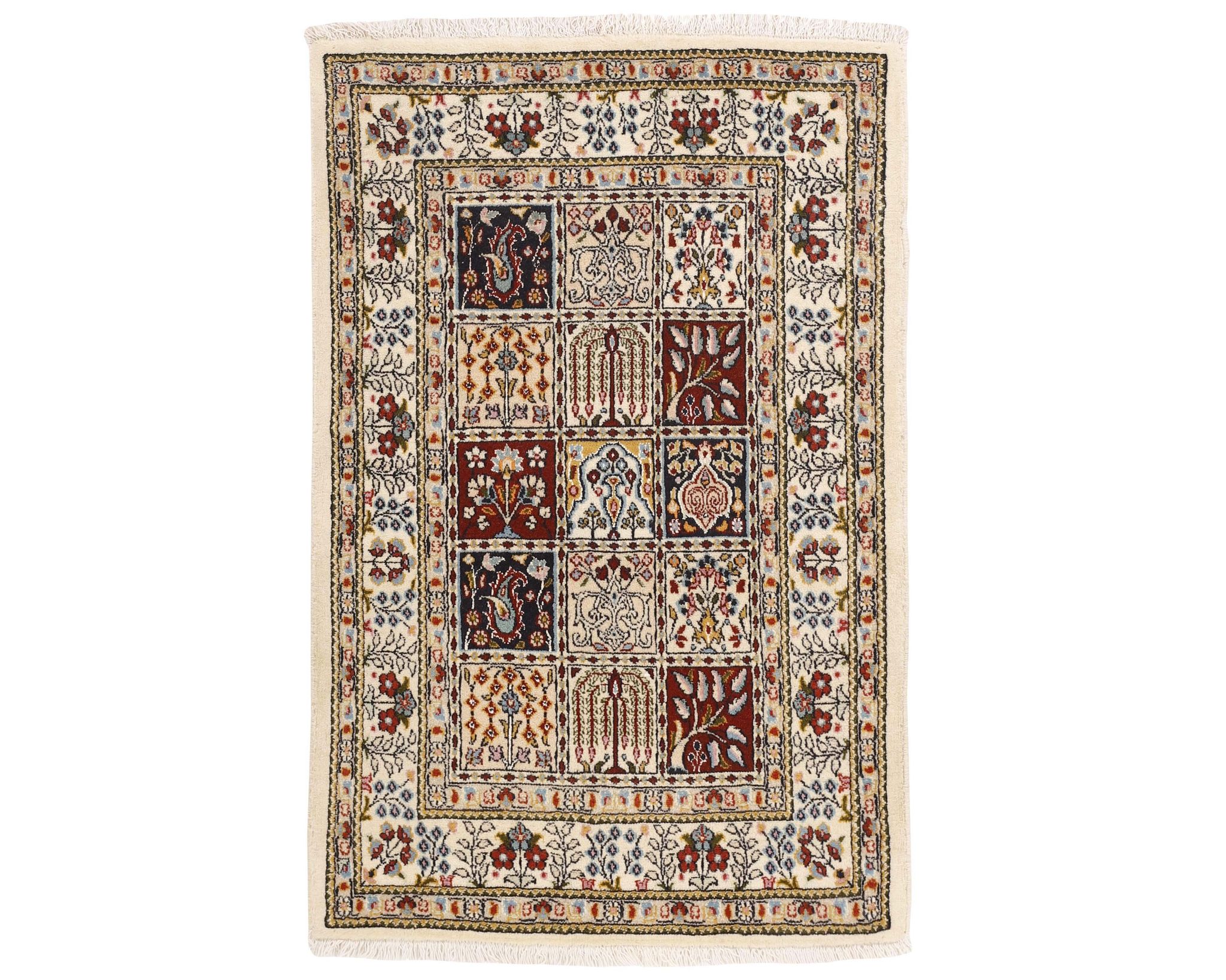 Moud Garden -matot ovat käsinsolmittuja villamattoja, joissa on puuvillinen loimi. Niiden kuviointi koostuu tyylitellystä puutarhakuvioista, jota kehystävät perinteiset persialaiset reunukset. Värimaailma on hillitty ja harmoninen, painottuen norsunluun, sinisen ja ruskean sävyihin. Solmutiheys on 250 000–350 000 solmua neliömetrillä. Käyttämätön.