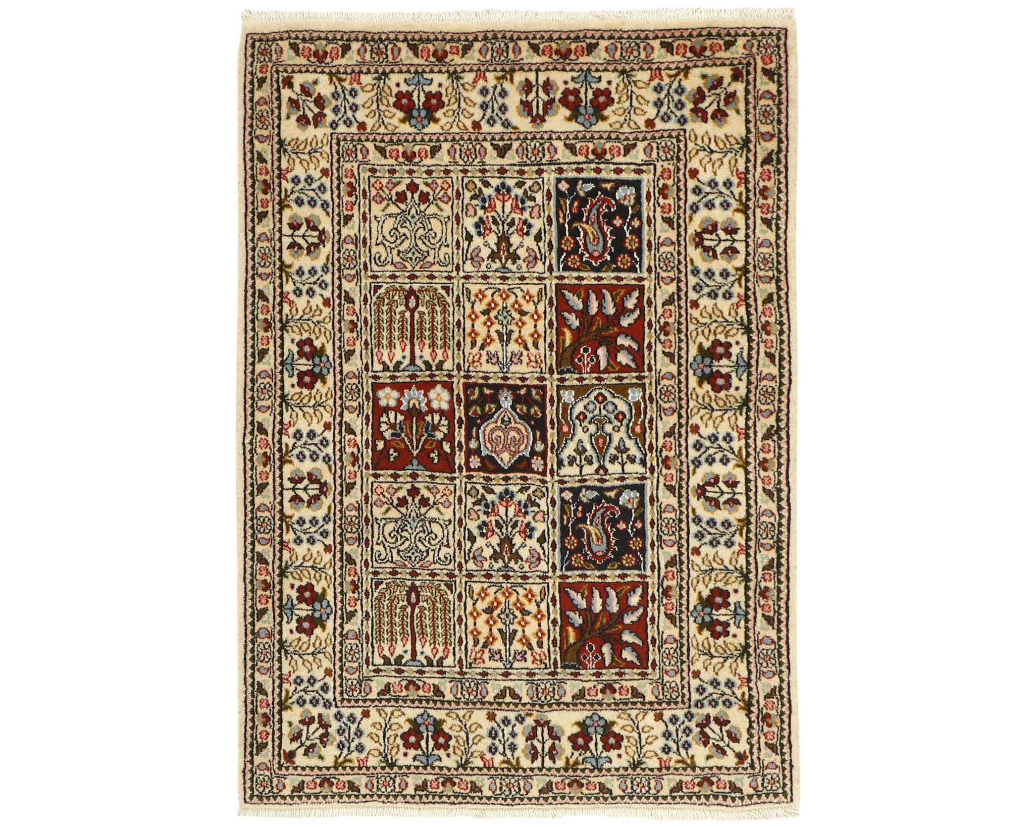 Moud Garden -matot ovat käsinsolmittuja villamattoja, joissa on puuvillinen loimi. Niiden kuviointi koostuu tyylitellystä puutarhakuvioista, jota kehystävät perinteiset persialaiset reunukset. Värimaailma on hillitty ja harmoninen, painottuen norsunluun, sinisen ja ruskean sävyihin. Solmutiheys on 250 000–350 000 solmua neliömetrillä. Käyttämätön.