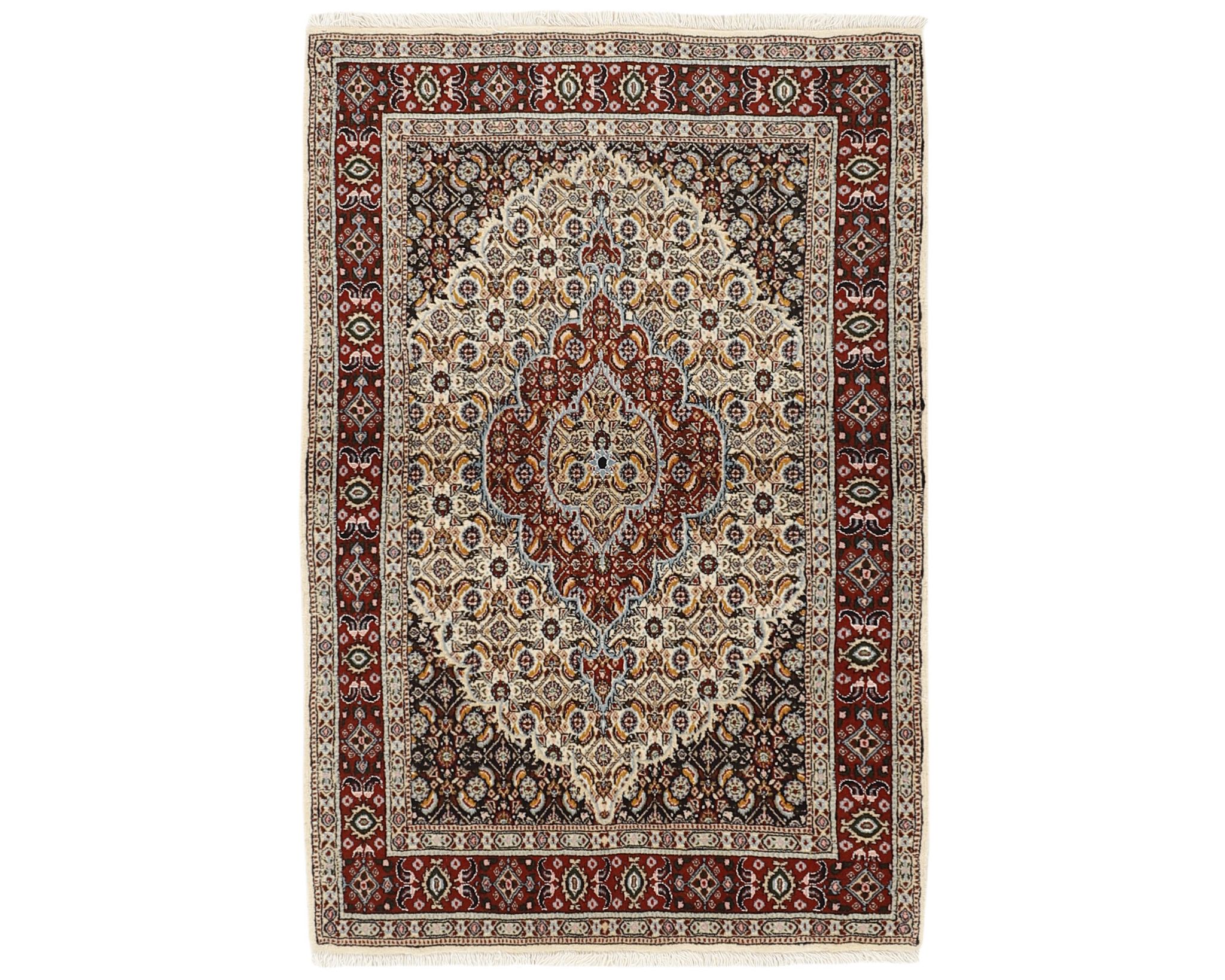 Moud Mahi -matot ovat käsinsolmittuja villamattoja, jotka valmistetaan Moudin kylässä Khorrasanin provinssissa. Kylän matot tunnetaan tasalaatuisuudestaan ja toistuvista Herati-kuvioistaan, ja joissakin malleissa esiintyy keskelle sijoittuva tähdenmuotoinen medaljonki. Väripaletti koostuu beigen, vaaleanpunaisen ja sinisen sävyistä, jotka antavat matoille jäsennellyn ja harmonisen ilmeen. Solmutiheys on 250 000–350 000 solmua neliömetrillä. Käyttämätön.