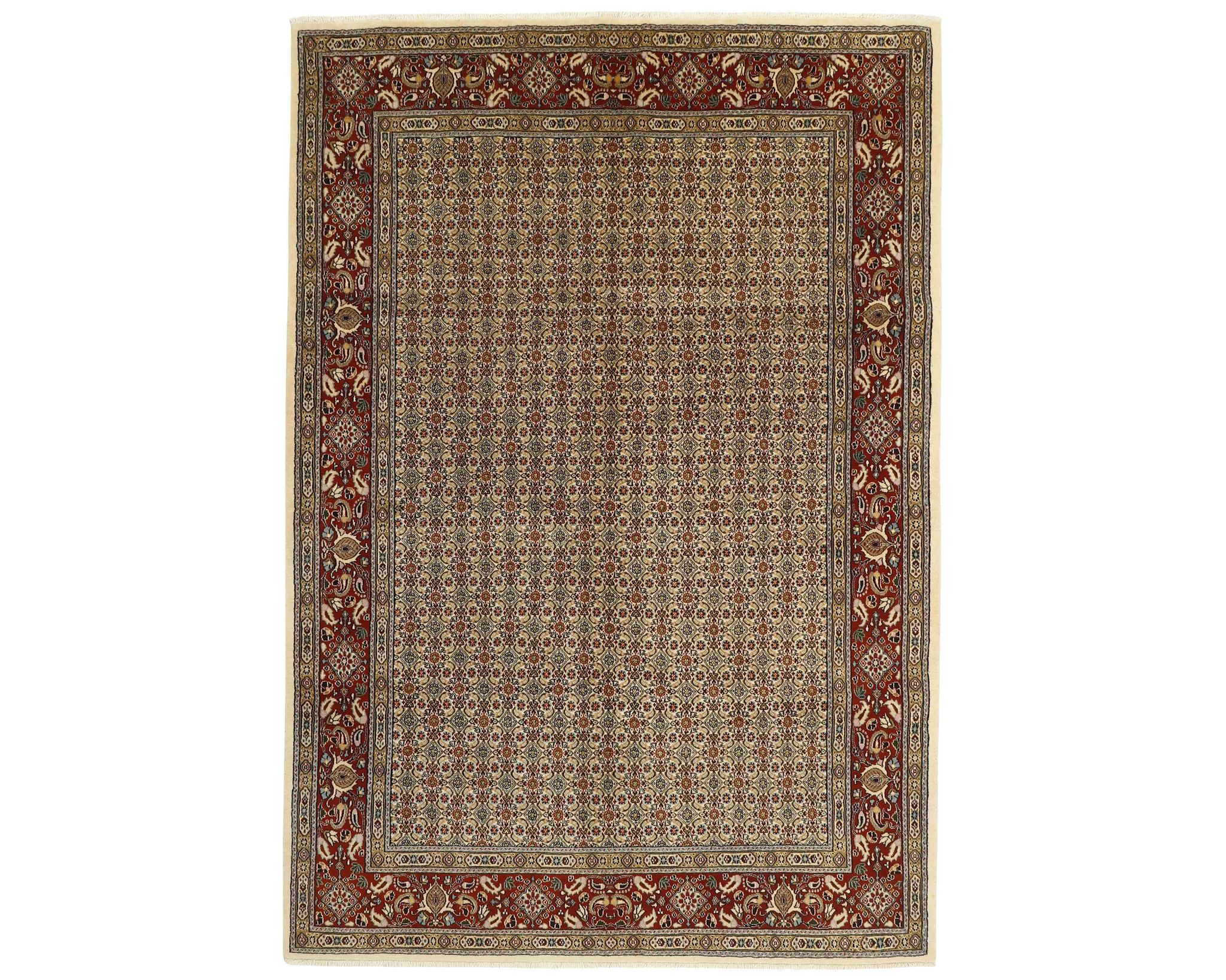 Moud Mahi -matot ovat käsinsolmittuja villamattoja, jotka valmistetaan Moudin kylässä Khorrasanin provinssissa. Kylän matot tunnetaan tasalaatuisuudestaan ja toistuvista Herati-kuvioistaan, ja joissakin malleissa esiintyy keskelle sijoittuva tähdenmuotoinen medaljonki. Väripaletti koostuu beigen, vaaleanpunaisen ja sinisen sävyistä, jotka antavat matoille jäsennellyn ja harmonisen ilmeen. Solmutiheys on 250 000–350 000 solmua neliömetrillä. Käyttämätön.