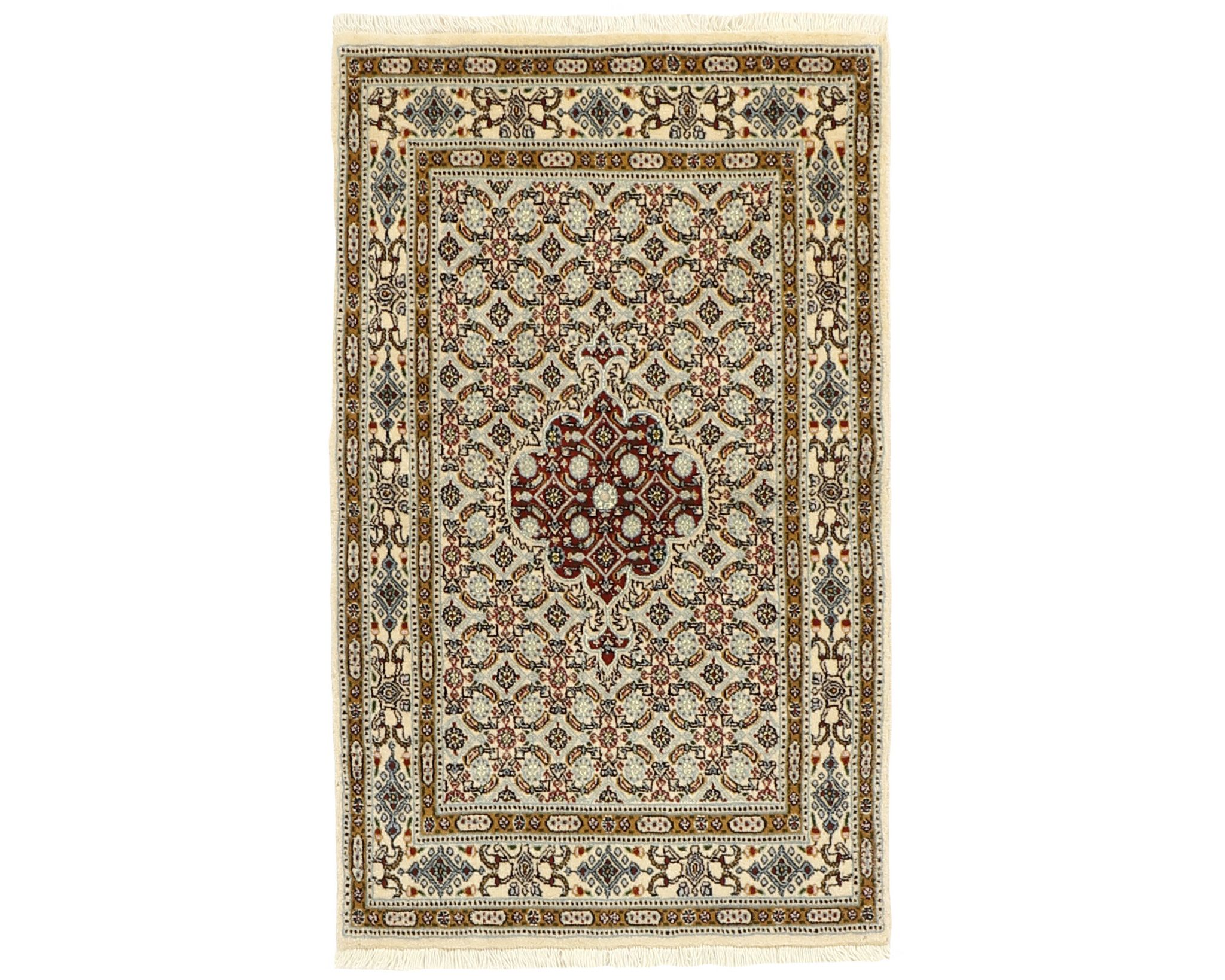 Moud Mahi -matot ovat käsinsolmittuja villamattoja, jotka valmistetaan Moudin kylässä Khorrasanin provinssissa. Kylän matot tunnetaan tasalaatuisuudestaan ja toistuvista Herati-kuvioistaan, ja joissakin malleissa esiintyy keskelle sijoittuva tähdenmuotoinen medaljonki. Väripaletti koostuu beigen, vaaleanpunaisen ja sinisen sävyistä, jotka antavat matoille jäsennellyn ja harmonisen ilmeen. Solmutiheys on 250 000–350 000 solmua neliömetrillä. Käyttämätön.