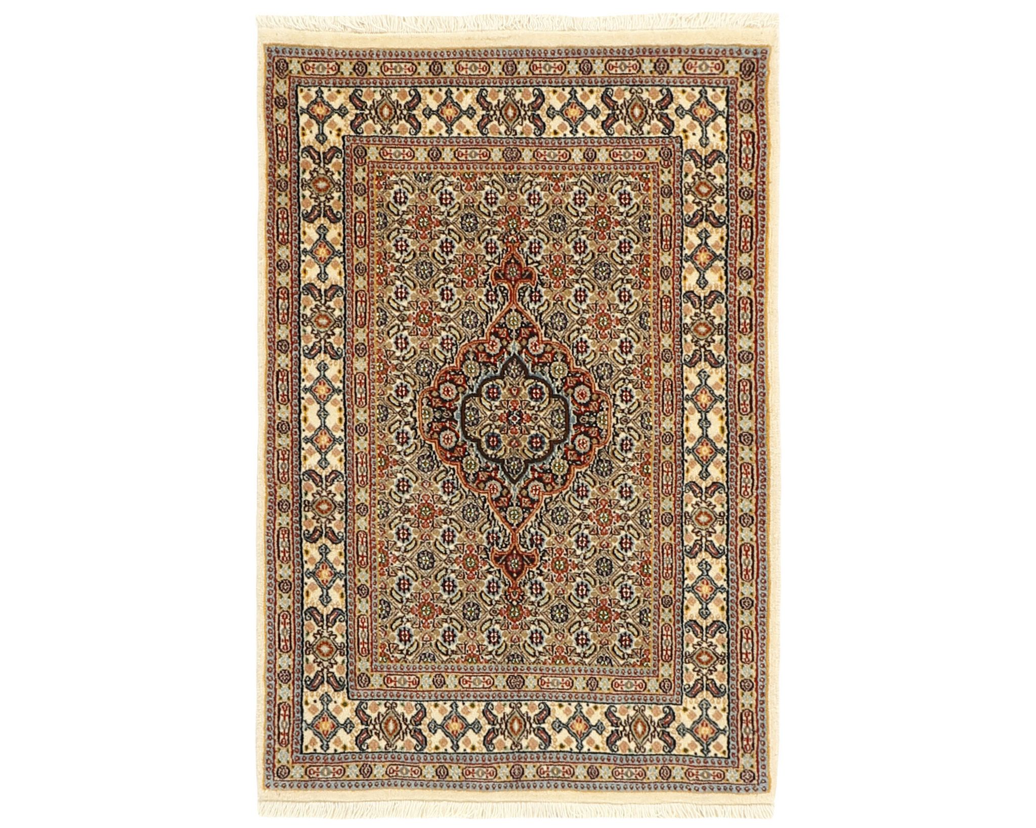 Moud Mahi -matot ovat käsinsolmittuja villamattoja, jotka valmistetaan Moudin kylässä Khorrasanin provinssissa. Kylän matot tunnetaan tasalaatuisuudestaan ja toistuvista Herati-kuvioistaan, ja joissakin malleissa esiintyy keskelle sijoittuva tähdenmuotoinen medaljonki. Väripaletti koostuu beigen, vaaleanpunaisen ja sinisen sävyistä, jotka antavat matoille jäsennellyn ja harmonisen ilmeen. Solmutiheys on 250 000–350 000 solmua neliömetrillä. Käyttämätön.