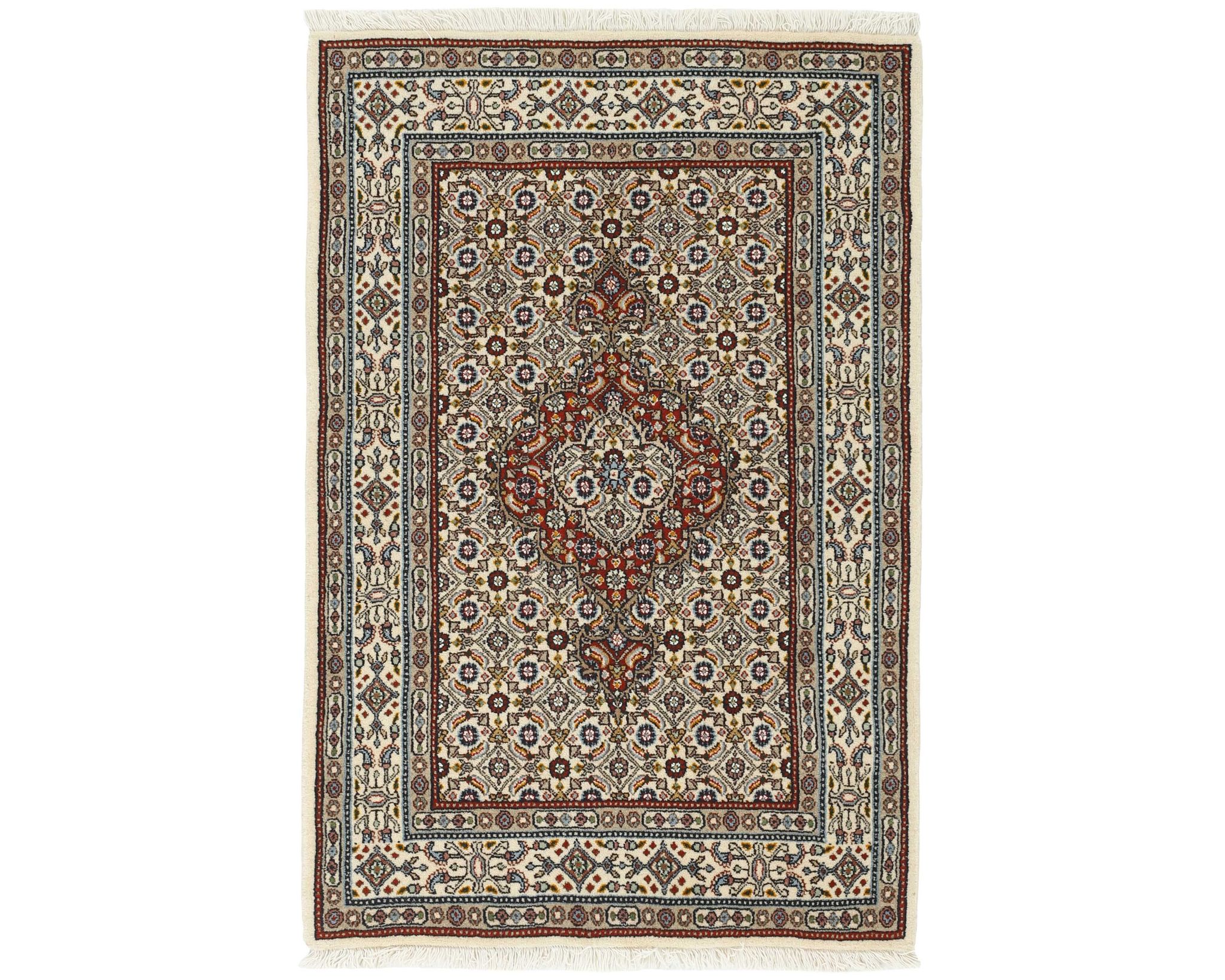 Moud Mahi -matot ovat käsinsolmittuja villamattoja, jotka valmistetaan Moudin kylässä Khorrasanin provinssissa. Kylän matot tunnetaan tasalaatuisuudestaan ja toistuvista Herati-kuvioistaan, ja joissakin malleissa esiintyy keskelle sijoittuva tähdenmuotoinen medaljonki. Väripaletti koostuu beigen, vaaleanpunaisen ja sinisen sävyistä, jotka antavat matoille jäsennellyn ja harmonisen ilmeen. Solmutiheys on 250 000–350 000 solmua neliömetrillä. Käyttämätön.