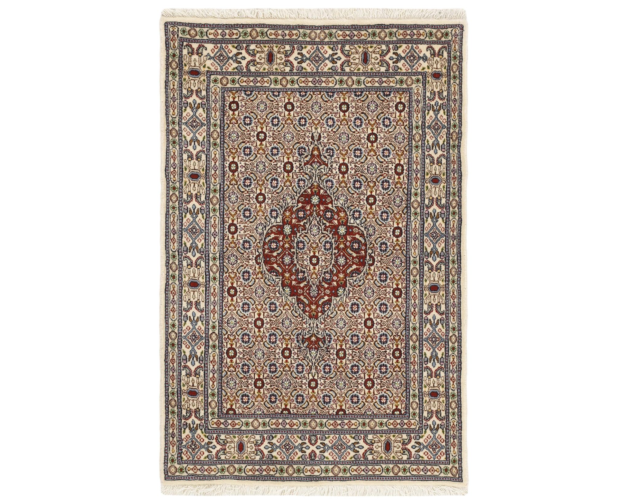 Moud Mahi -matot ovat käsinsolmittuja villamattoja, jotka valmistetaan Moudin kylässä Khorrasanin provinssissa. Kylän matot tunnetaan tasalaatuisuudestaan ja toistuvista Herati-kuvioistaan, ja joissakin malleissa esiintyy keskelle sijoittuva tähdenmuotoinen medaljonki. Väripaletti koostuu beigen, vaaleanpunaisen ja sinisen sävyistä, jotka antavat matoille jäsennellyn ja harmonisen ilmeen. Solmutiheys on 250 000–350 000 solmua neliömetrillä. Käyttämätön.