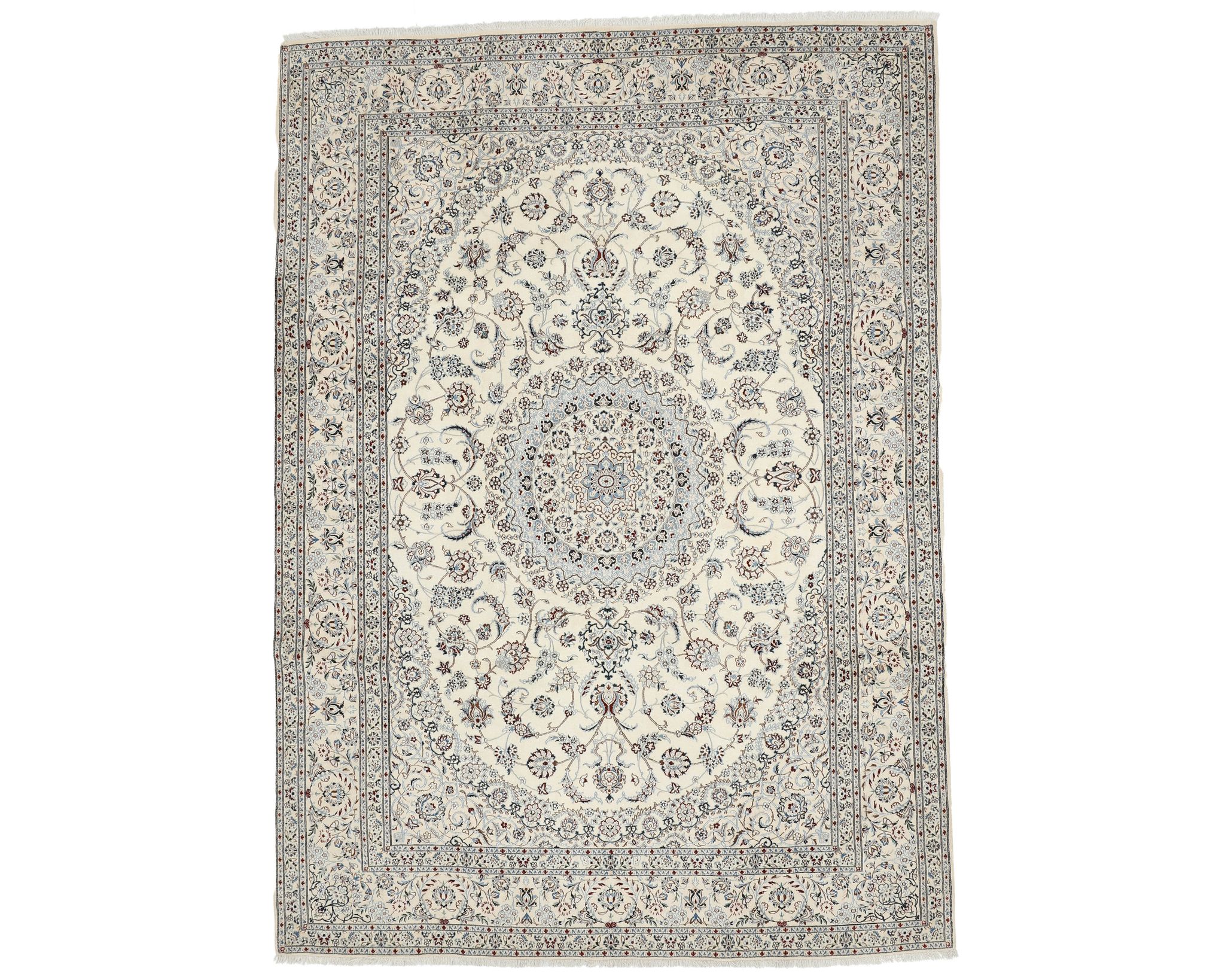 Nain 6 la -matot edustavat Nain-mattojen korkeinta laatuluokkaa. Ne valmistetaan villan ja silkin sekoitteesta, mikä luo pinnan, joka on poikkeuksellisen hieno ja yksityiskohtainen. Klassiset kuviot, silkkilangan korostamat ääriviivat ja hillitty värimaailma antavat matoille erittäin elegantin ja viimeistellyn ilmeen. Solmutiheys on 850 000–950 000 solmua neliömetrillä, mikä tekee matoista sileitä, tiiviitä ja poikkeuksellisen kestäviä. Käyttämätön.