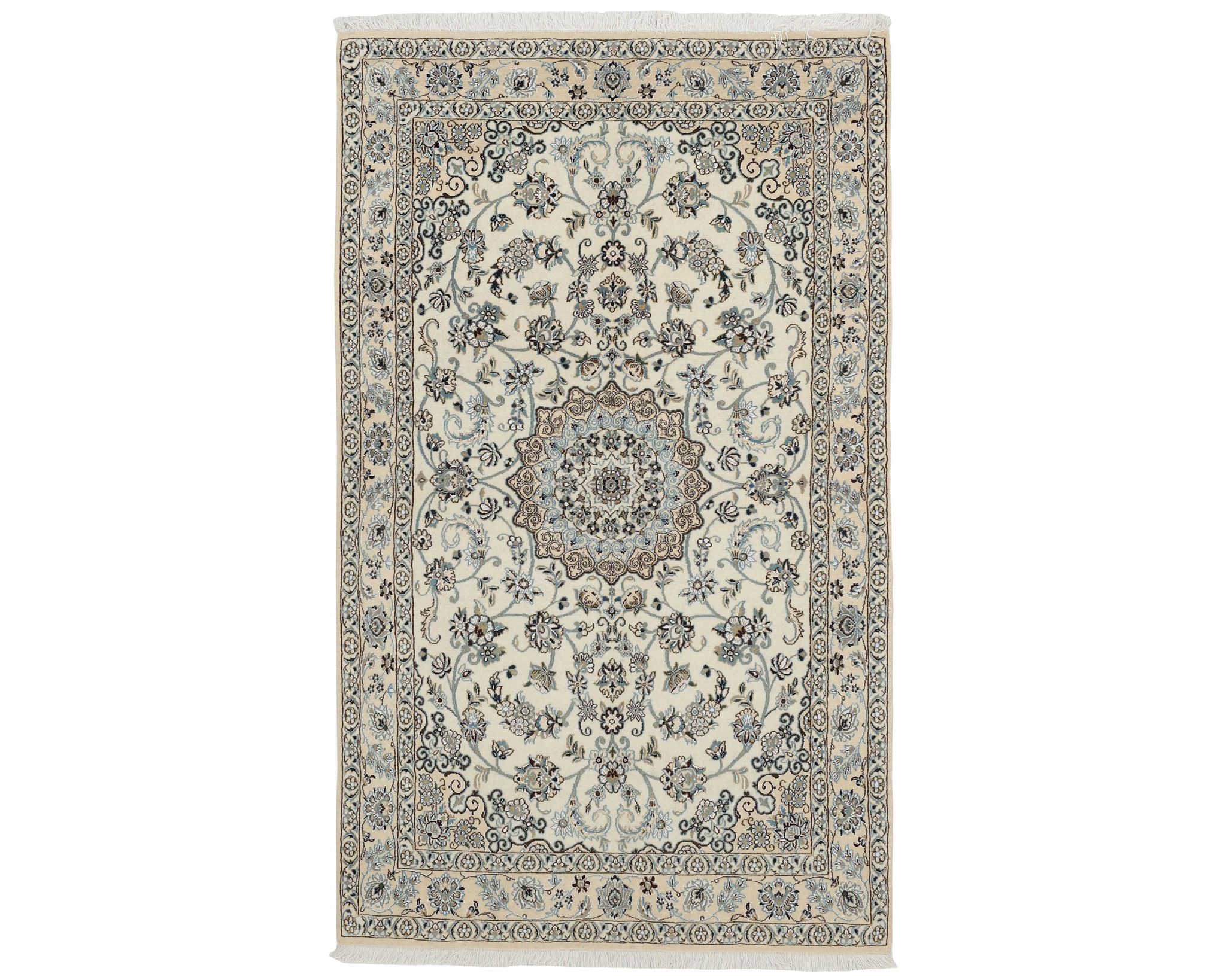 Nain 9 la -matot ovat käsinsolmittuja villa-silkkimattoja. Silkki antaa matoille niiden tunnusomaisen, elegantin ilmeen: se lisää pintaan kaunista kiiltoa ja syvyyttä sekä korostaa kuvioiden hienoja yksityiskohtia. Klassinen kuviointi ja hillitty väripaletti painottuvat norsunluun ja beigen sävyihin, joita täydentävät hienovaraiset punaisen, vihreän ja sinisen vivahteet. Matot valmistetaan Nainissa Iranissa, ja niiden solmutiheys on 350 000–450 000 solmua neliömetrillä. Käyttämätön.