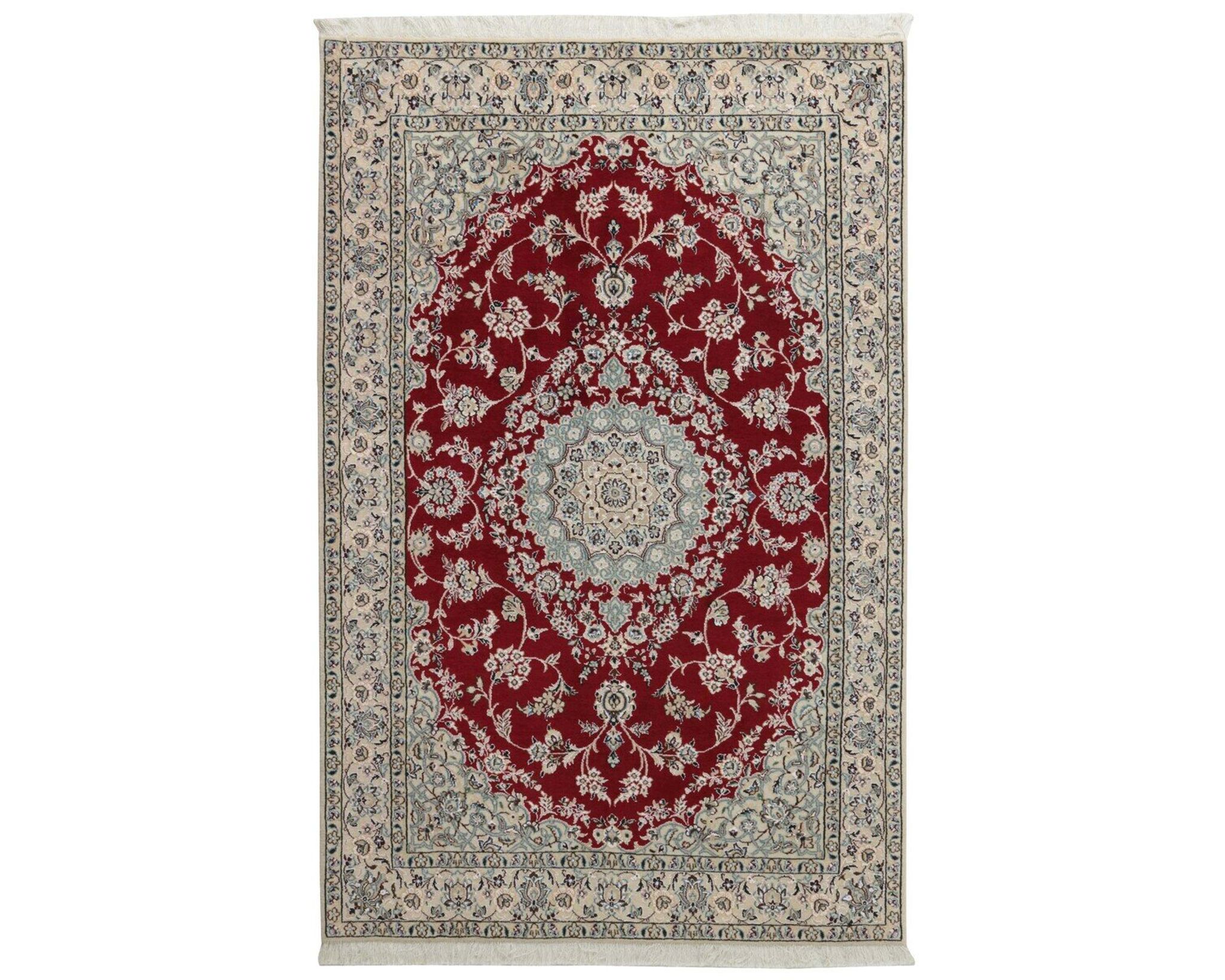 Nain 9 la -matot ovat käsinsolmittuja villa-silkkimattoja. Silkki antaa matoille niiden tunnusomaisen, elegantin ilmeen: se lisää pintaan kaunista kiiltoa ja syvyyttä sekä korostaa kuvioiden hienoja yksityiskohtia. Klassinen kuviointi ja hillitty väripaletti painottuvat norsunluun ja beigen sävyihin, joita täydentävät hienovaraiset punaisen, vihreän ja sinisen vivahteet. Matot valmistetaan Nainissa Iranissa, ja niiden solmutiheys on 350 000–450 000 solmua neliömetrillä. Käyttämätön.