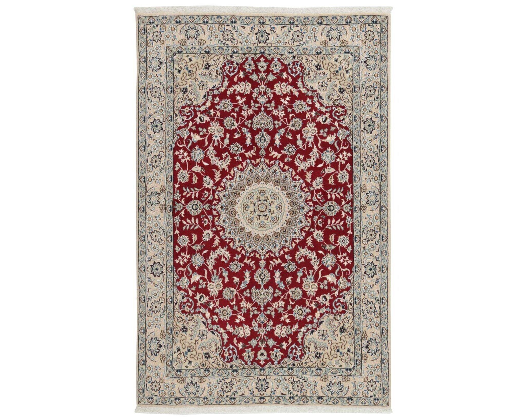 Nain 9 la -matot ovat käsinsolmittuja villa-silkkimattoja. Silkki antaa matoille niiden tunnusomaisen, elegantin ilmeen: se lisää pintaan kaunista kiiltoa ja syvyyttä sekä korostaa kuvioiden hienoja yksityiskohtia. Klassinen kuviointi ja hillitty väripaletti painottuvat norsunluun ja beigen sävyihin, joita täydentävät hienovaraiset punaisen, vihreän ja sinisen vivahteet. Matot valmistetaan Nainissa Iranissa, ja niiden solmutiheys on 350 000–450 000 solmua neliömetrillä. Käyttämätön.