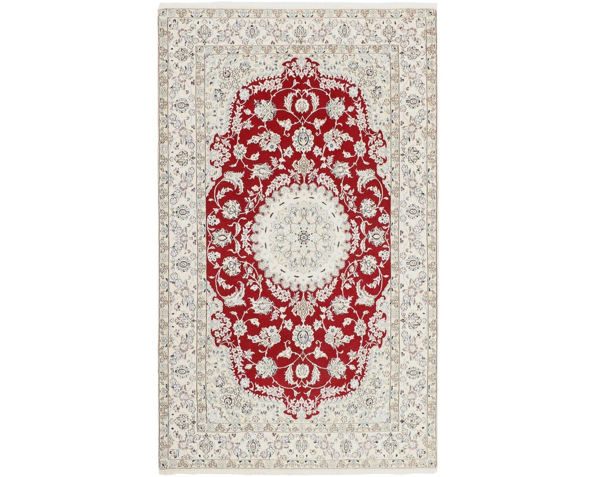 Nain 9 la -matot ovat käsinsolmittuja villa-silkkimattoja. Silkki antaa matoille niiden tunnusomaisen, elegantin ilmeen: se lisää pintaan kaunista kiiltoa ja syvyyttä sekä korostaa kuvioiden hienoja yksityiskohtia. Klassinen kuviointi ja hillitty väripaletti painottuvat norsunluun ja beigen sävyihin, joita täydentävät hienovaraiset punaisen, vihreän ja sinisen vivahteet. Matot valmistetaan Nainissa Iranissa, ja niiden solmutiheys on 350 000–450 000 solmua neliömetrillä. Käyttämätön.