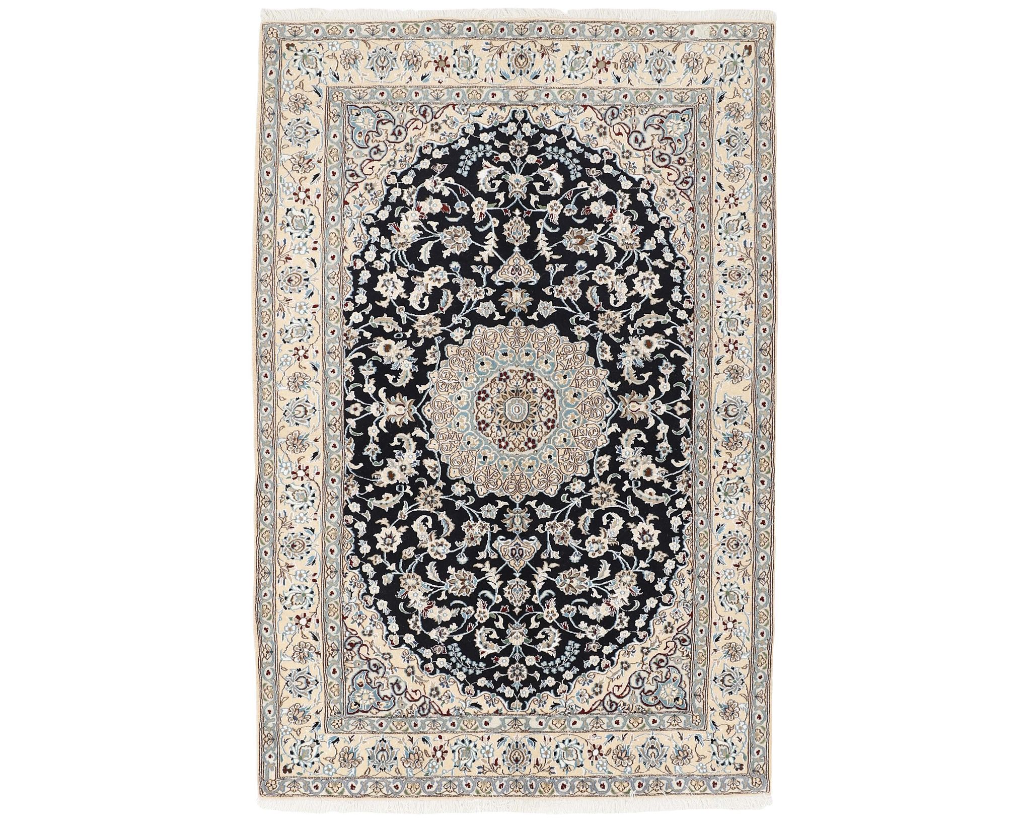 Nain 9 la -matot ovat käsinsolmittuja villa-silkkimattoja. Silkki antaa matoille niiden tunnusomaisen, elegantin ilmeen: se lisää pintaan kaunista kiiltoa ja syvyyttä sekä korostaa kuvioiden hienoja yksityiskohtia. Klassinen kuviointi ja hillitty väripaletti painottuvat norsunluun ja beigen sävyihin, joita täydentävät hienovaraiset punaisen, vihreän ja sinisen vivahteet. Matot valmistetaan Nainissa Iranissa, ja niiden solmutiheys on 350 000–450 000 solmua neliömetrillä. Käyttämätön.