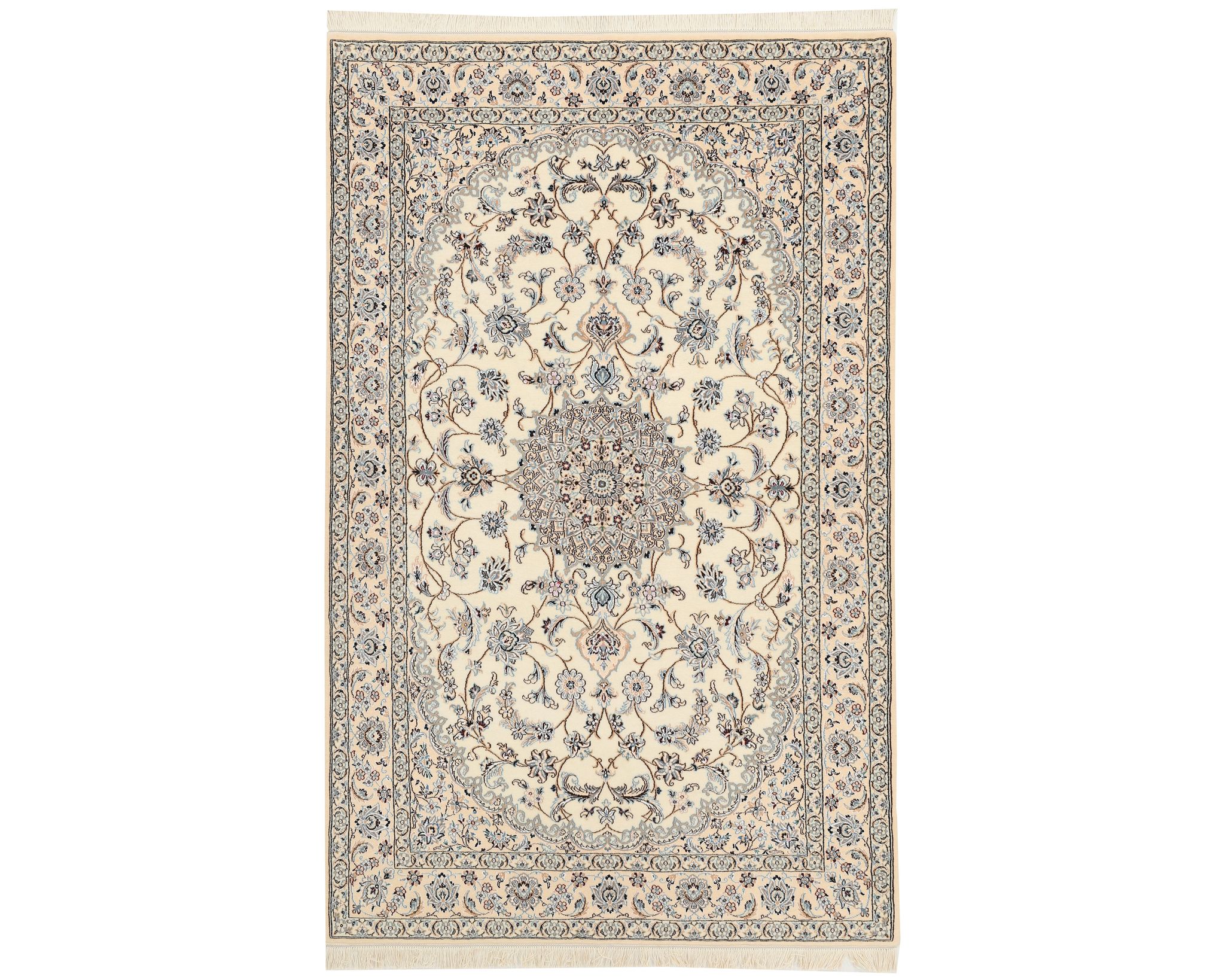 Nain 9 la -matot ovat käsinsolmittuja villa-silkkimattoja. Silkki antaa matoille niiden tunnusomaisen, elegantin ilmeen: se lisää pintaan kaunista kiiltoa ja syvyyttä sekä korostaa kuvioiden hienoja yksityiskohtia. Klassinen kuviointi ja hillitty väripaletti painottuvat norsunluun ja beigen sävyihin, joita täydentävät hienovaraiset punaisen, vihreän ja sinisen vivahteet. Matot valmistetaan Nainissa Iranissa, ja niiden solmutiheys on 350 000–450 000 solmua neliömetrillä. Käyttämätön.