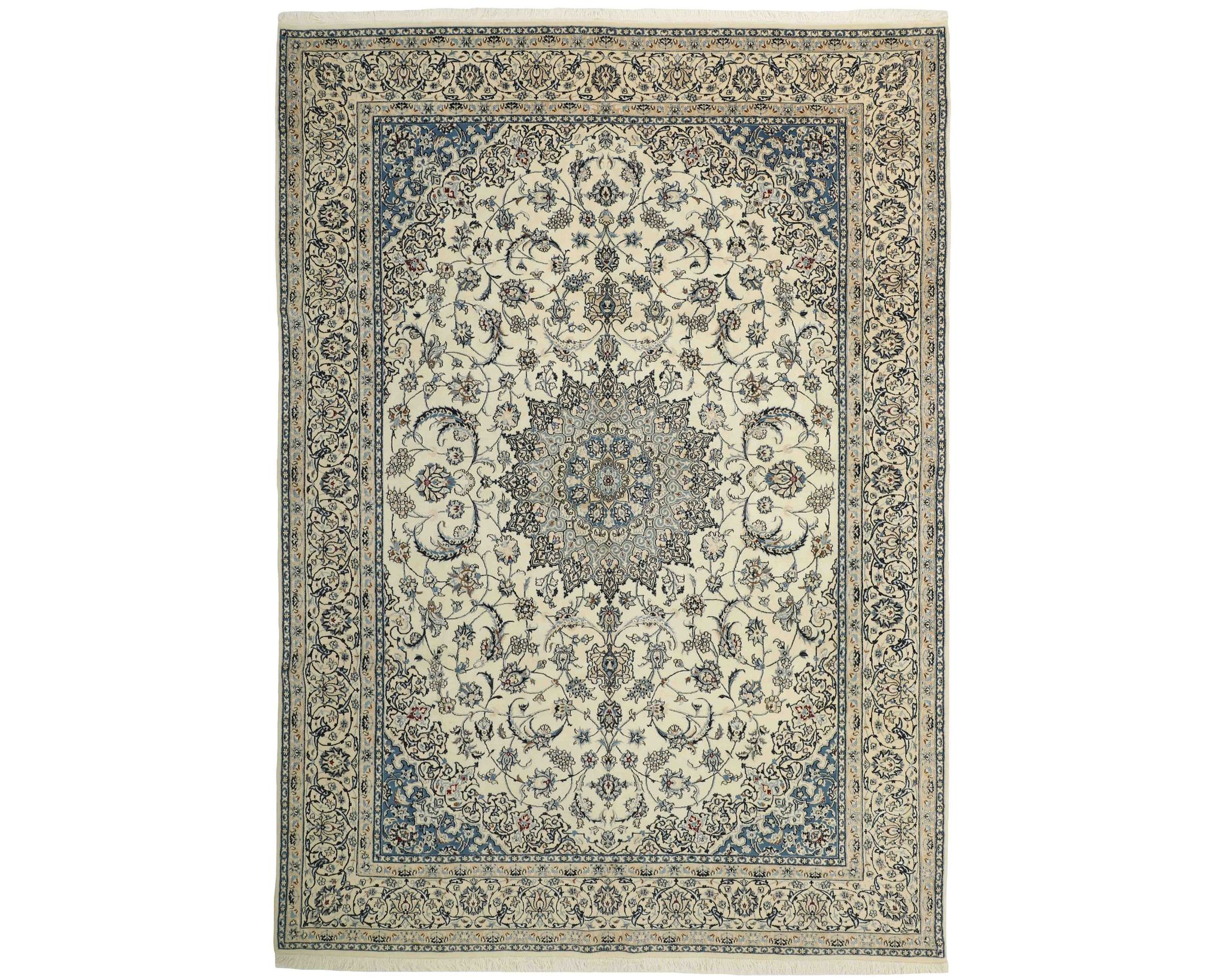 Nain 9 la -matot ovat käsinsolmittuja villa-silkkimattoja. Silkki antaa matoille niiden tunnusomaisen, elegantin ilmeen: se lisää pintaan kaunista kiiltoa ja syvyyttä sekä korostaa kuvioiden hienoja yksityiskohtia. Klassinen kuviointi ja hillitty väripaletti painottuvat norsunluun ja beigen sävyihin, joita täydentävät hienovaraiset punaisen, vihreän ja sinisen vivahteet. Matot valmistetaan Nainissa Iranissa, ja niiden solmutiheys on 350 000–450 000 solmua neliömetrillä. Käyttämätön.