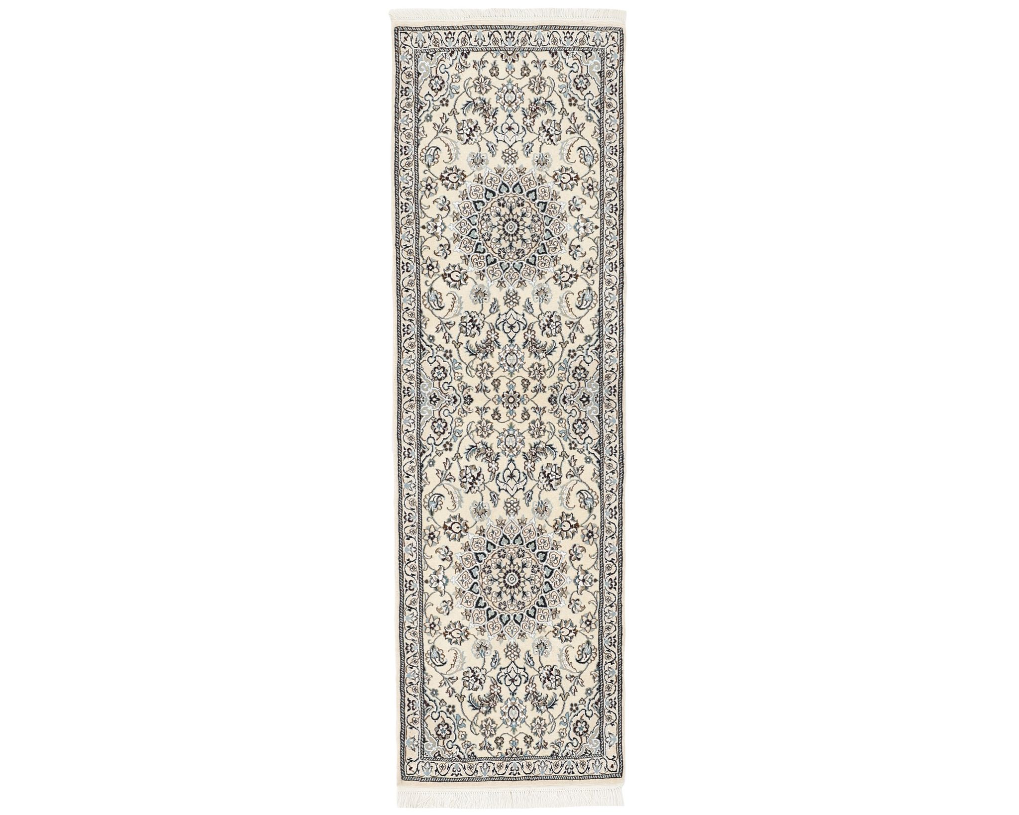 Nain 9 la -matot ovat käsinsolmittuja villa-silkkimattoja. Silkki antaa matoille niiden tunnusomaisen, elegantin ilmeen: se lisää pintaan kaunista kiiltoa ja syvyyttä sekä korostaa kuvioiden hienoja yksityiskohtia. Klassinen kuviointi ja hillitty väripaletti painottuvat norsunluun ja beigen sävyihin, joita täydentävät hienovaraiset punaisen, vihreän ja sinisen vivahteet. Matot valmistetaan Nainissa Iranissa, ja niiden solmutiheys on 350 000–450 000 solmua neliömetrillä. Käyttämätön.