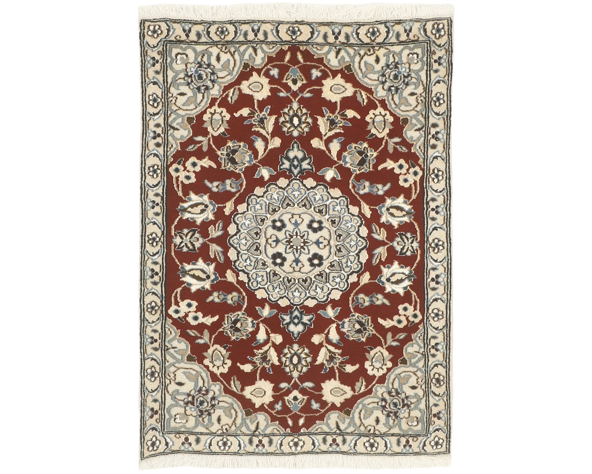Nain 9 la -matot ovat käsinsolmittuja villa-silkkimattoja. Silkki antaa matoille niiden tunnusomaisen, elegantin ilmeen: se lisää pintaan kaunista kiiltoa ja syvyyttä sekä korostaa kuvioiden hienoja yksityiskohtia. Klassinen kuviointi ja hillitty väripaletti painottuvat norsunluun ja beigen sävyihin, joita täydentävät hienovaraiset punaisen, vihreän ja sinisen vivahteet. Matot valmistetaan Nainissa Iranissa, ja niiden solmutiheys on 350 000–450 000 solmua neliömetrillä. Käyttämätön.