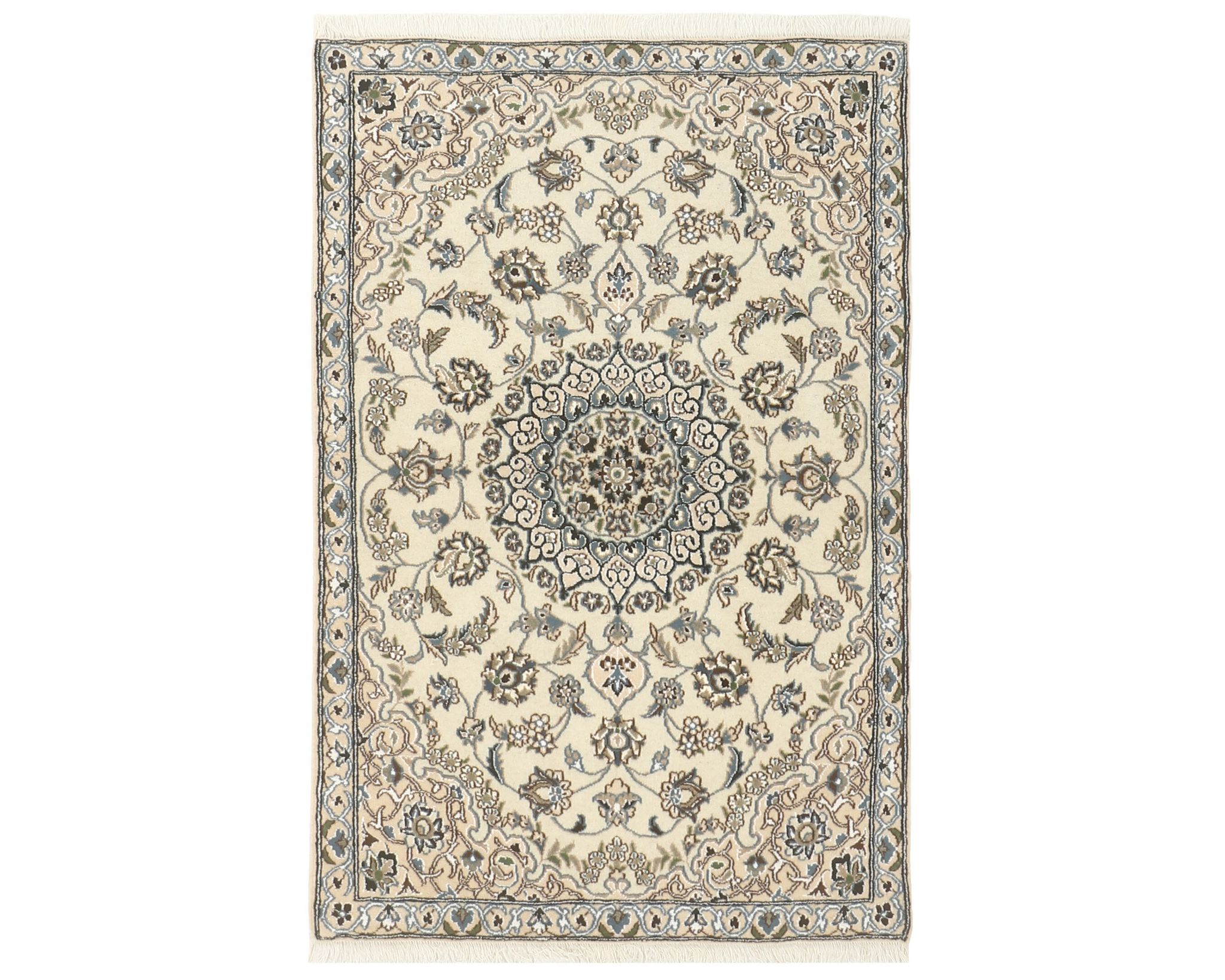 Nain 9 la -matot ovat käsinsolmittuja villa-silkkimattoja. Silkki antaa matoille niiden tunnusomaisen, elegantin ilmeen: se lisää pintaan kaunista kiiltoa ja syvyyttä sekä korostaa kuvioiden hienoja yksityiskohtia. Klassinen kuviointi ja hillitty väripaletti painottuvat norsunluun ja beigen sävyihin, joita täydentävät hienovaraiset punaisen, vihreän ja sinisen vivahteet. Matot valmistetaan Nainissa Iranissa, ja niiden solmutiheys on 350 000–450 000 solmua neliömetrillä. Käyttämätön.