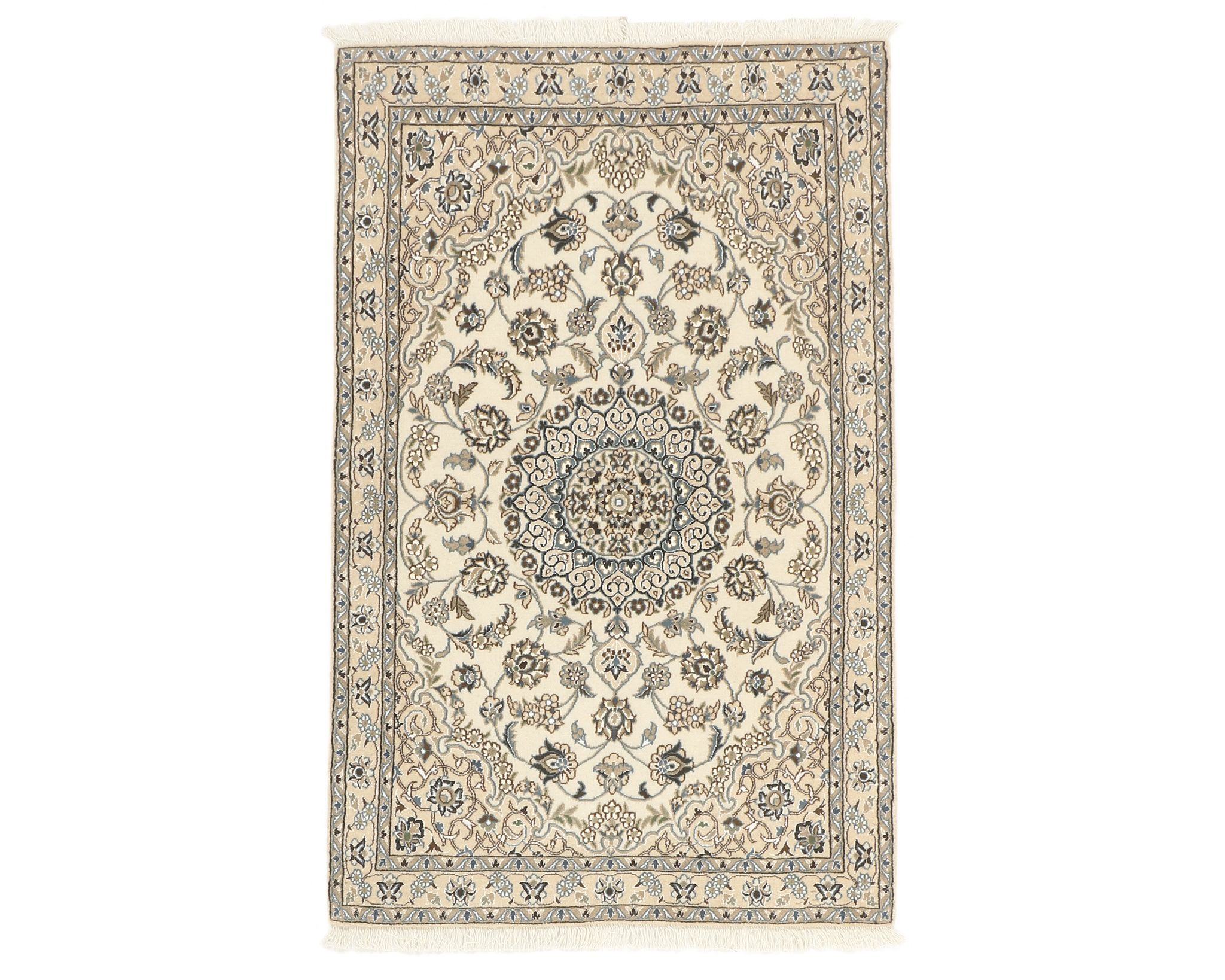 Nain 9 la -matot ovat käsinsolmittuja villa-silkkimattoja. Silkki antaa matoille niiden tunnusomaisen, elegantin ilmeen: se lisää pintaan kaunista kiiltoa ja syvyyttä sekä korostaa kuvioiden hienoja yksityiskohtia. Klassinen kuviointi ja hillitty väripaletti painottuvat norsunluun ja beigen sävyihin, joita täydentävät hienovaraiset punaisen, vihreän ja sinisen vivahteet. Matot valmistetaan Nainissa Iranissa, ja niiden solmutiheys on 350 000–450 000 solmua neliömetrillä. Käyttämätön.