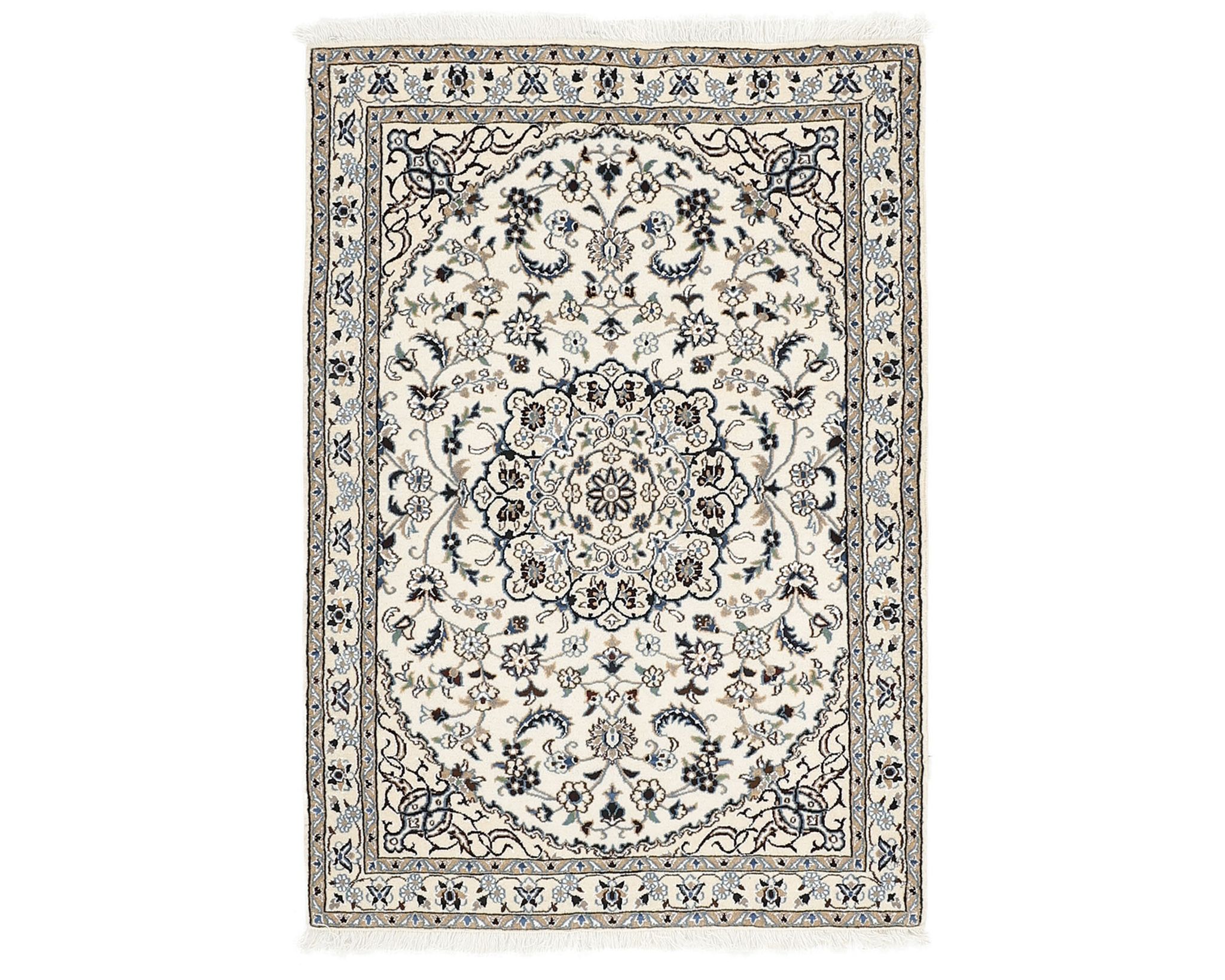 Nain 9 la -matot ovat käsinsolmittuja villa-silkkimattoja. Silkki antaa matoille niiden tunnusomaisen, elegantin ilmeen: se lisää pintaan kaunista kiiltoa ja syvyyttä sekä korostaa kuvioiden hienoja yksityiskohtia. Klassinen kuviointi ja hillitty väripaletti painottuvat norsunluun ja beigen sävyihin, joita täydentävät hienovaraiset punaisen, vihreän ja sinisen vivahteet. Matot valmistetaan Nainissa Iranissa, ja niiden solmutiheys on 350 000–450 000 solmua neliömetrillä. Käyttämätön.