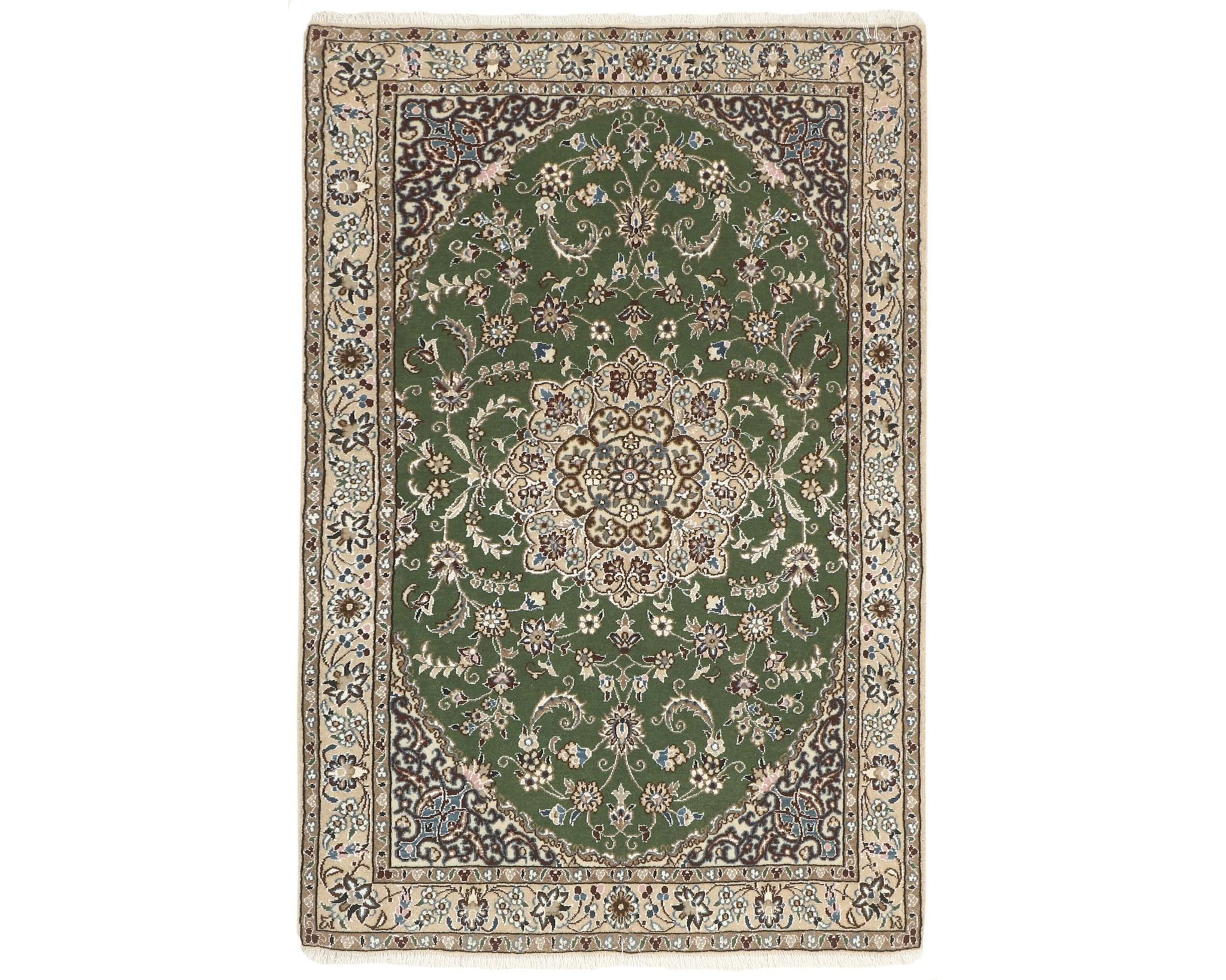 Nain 9 la -matot ovat käsinsolmittuja villa-silkkimattoja. Silkki antaa matoille niiden tunnusomaisen, elegantin ilmeen: se lisää pintaan kaunista kiiltoa ja syvyyttä sekä korostaa kuvioiden hienoja yksityiskohtia. Klassinen kuviointi ja hillitty väripaletti painottuvat norsunluun ja beigen sävyihin, joita täydentävät hienovaraiset punaisen, vihreän ja sinisen vivahteet. Matot valmistetaan Nainissa Iranissa, ja niiden solmutiheys on 350 000–450 000 solmua neliömetrillä. Käyttämätön.